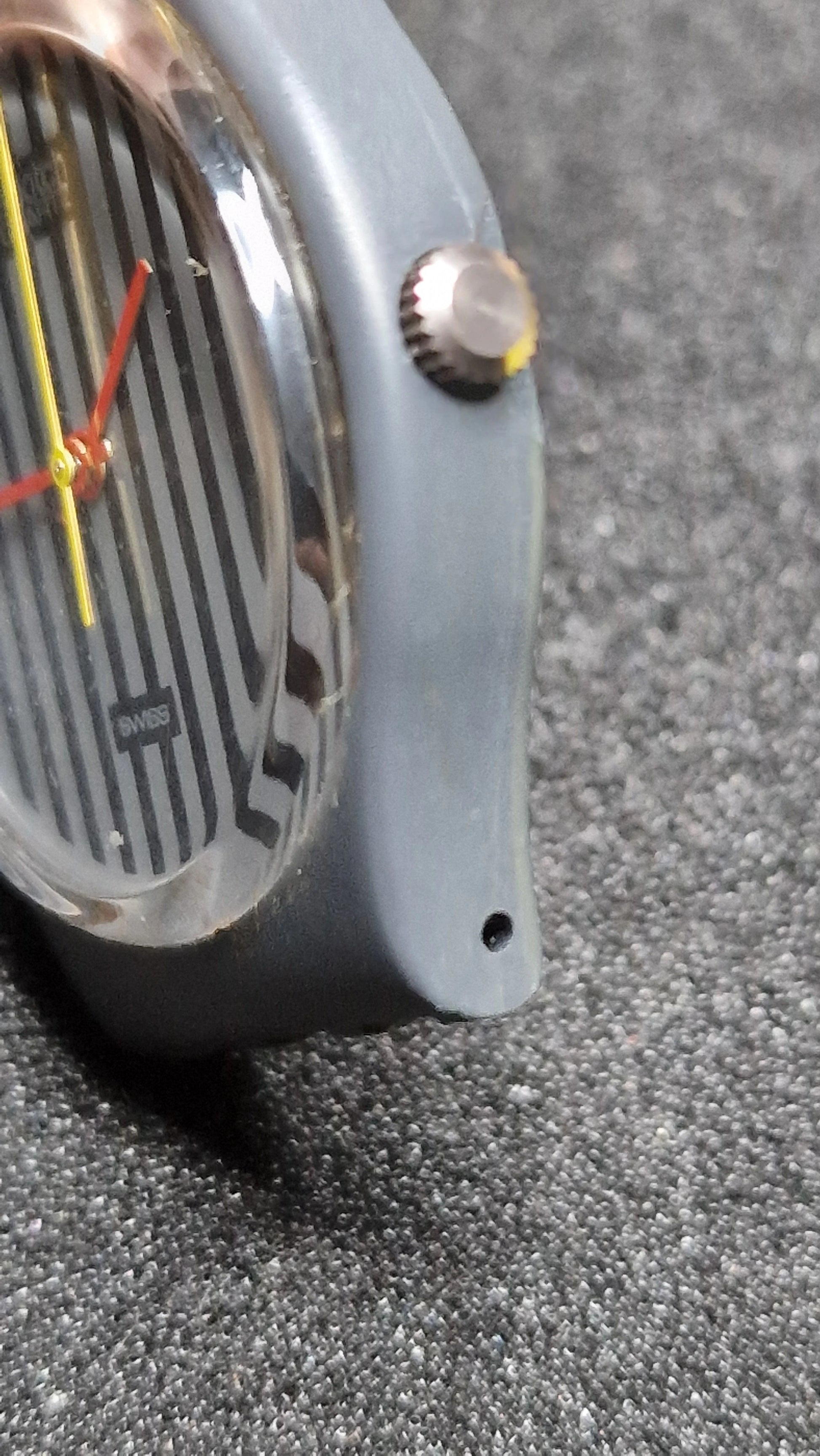 Dial: Black/grey vertical pinstripe dial, red hour/minute hands + yellow seconds hand