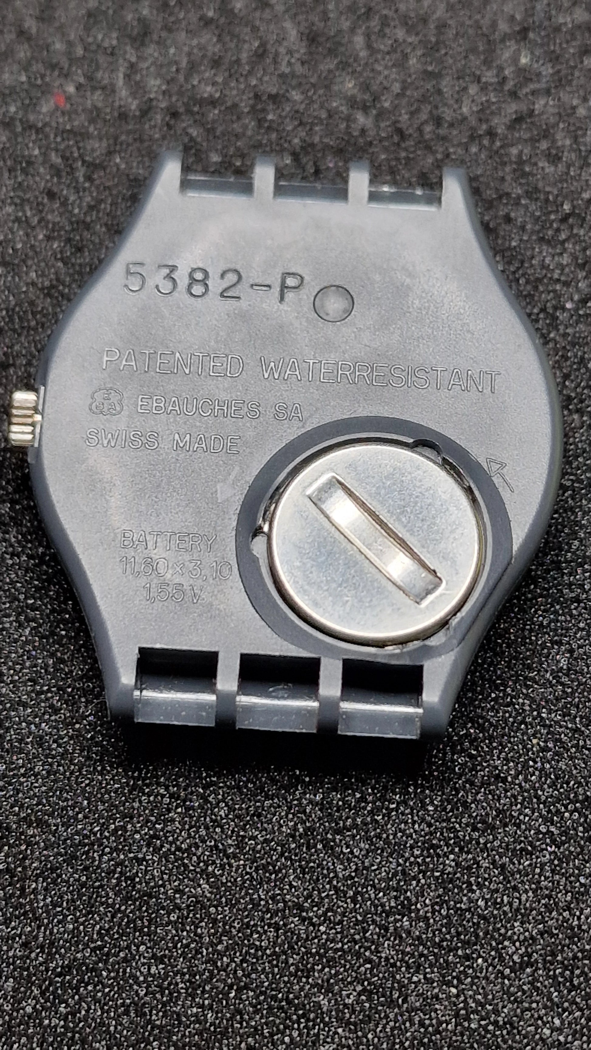 Caseback: Marked “5382-P”, “PATENTED WATERRESISTANT”, “EBAUCHES SA”, “SWISS MADE”