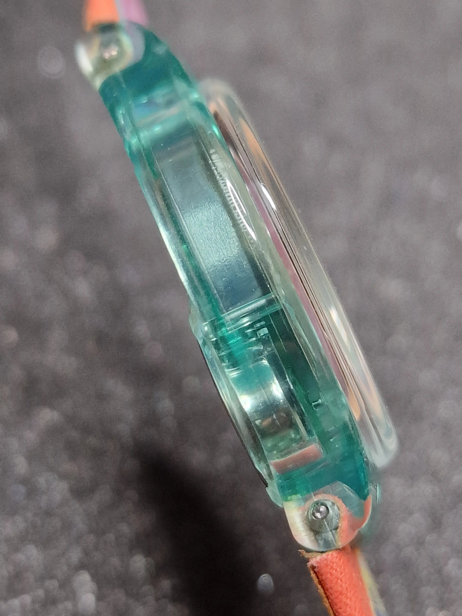 A stunning vintage Swatch from 1991, the GL103 “Mogador” embodies the artistic and multicultural flair of the early 90s. With its vivid patterns, transparent turquoise case, and fabric-style strap, it’s a wearable piece of art that celebrates global creativity.
