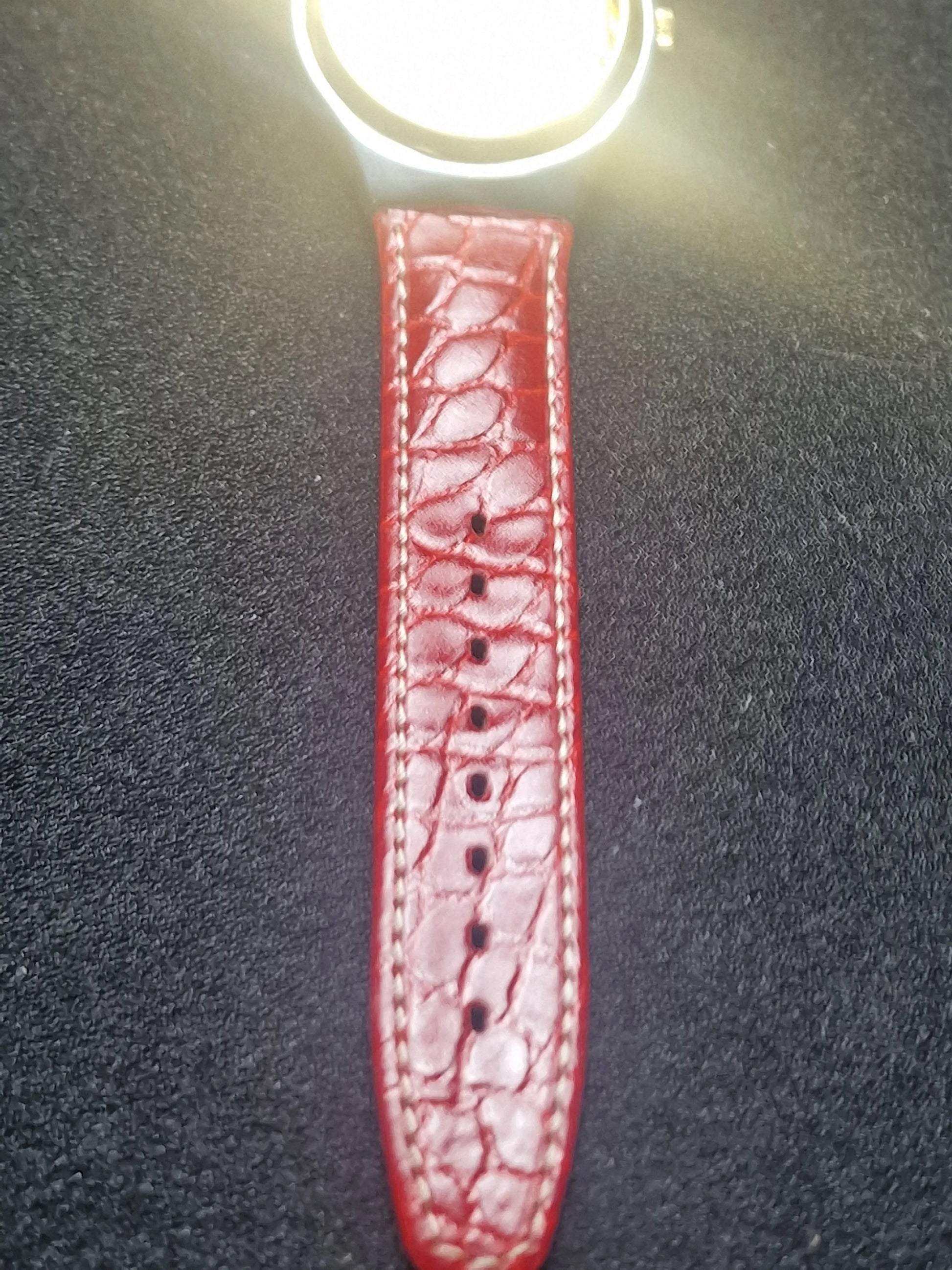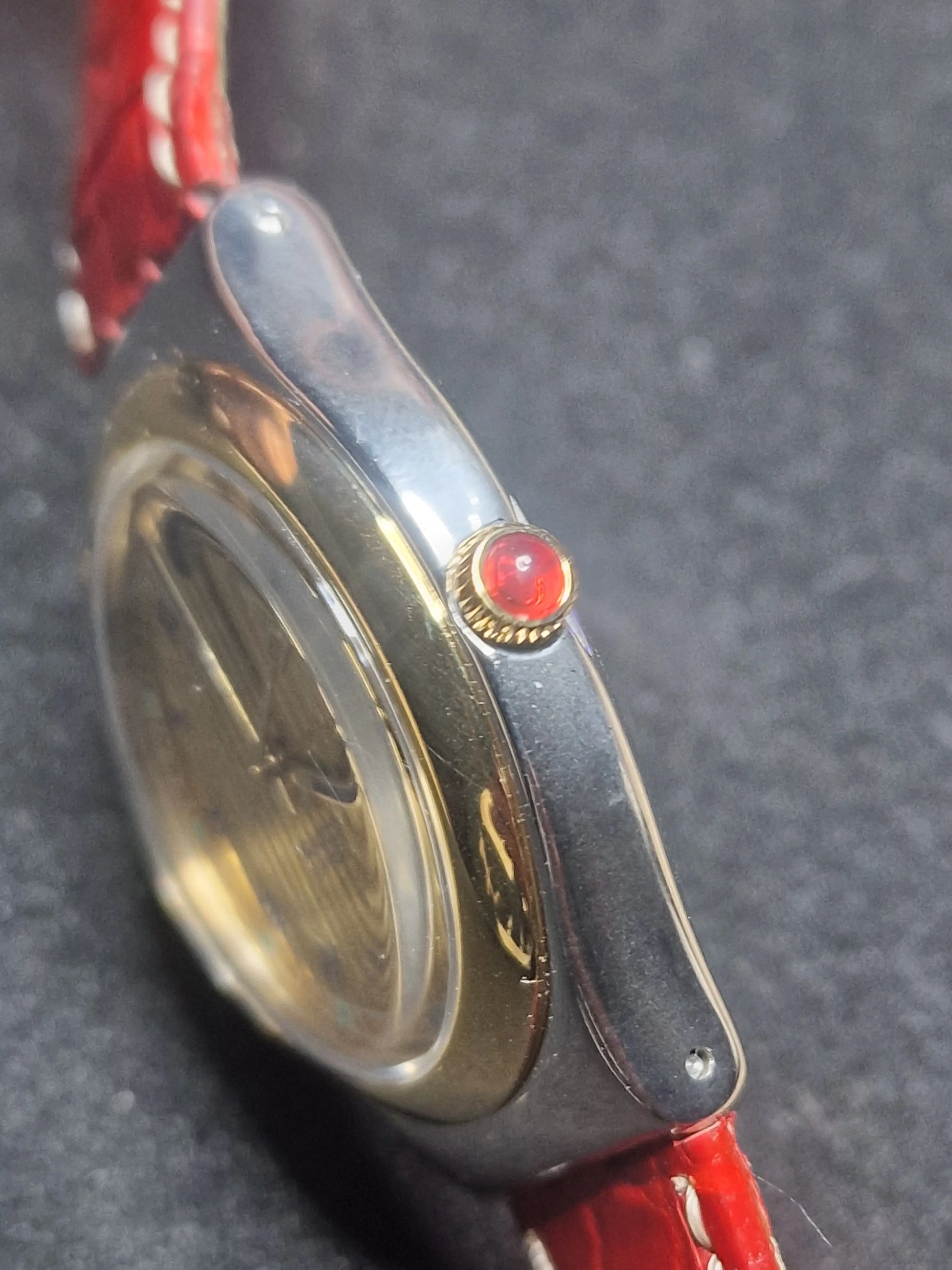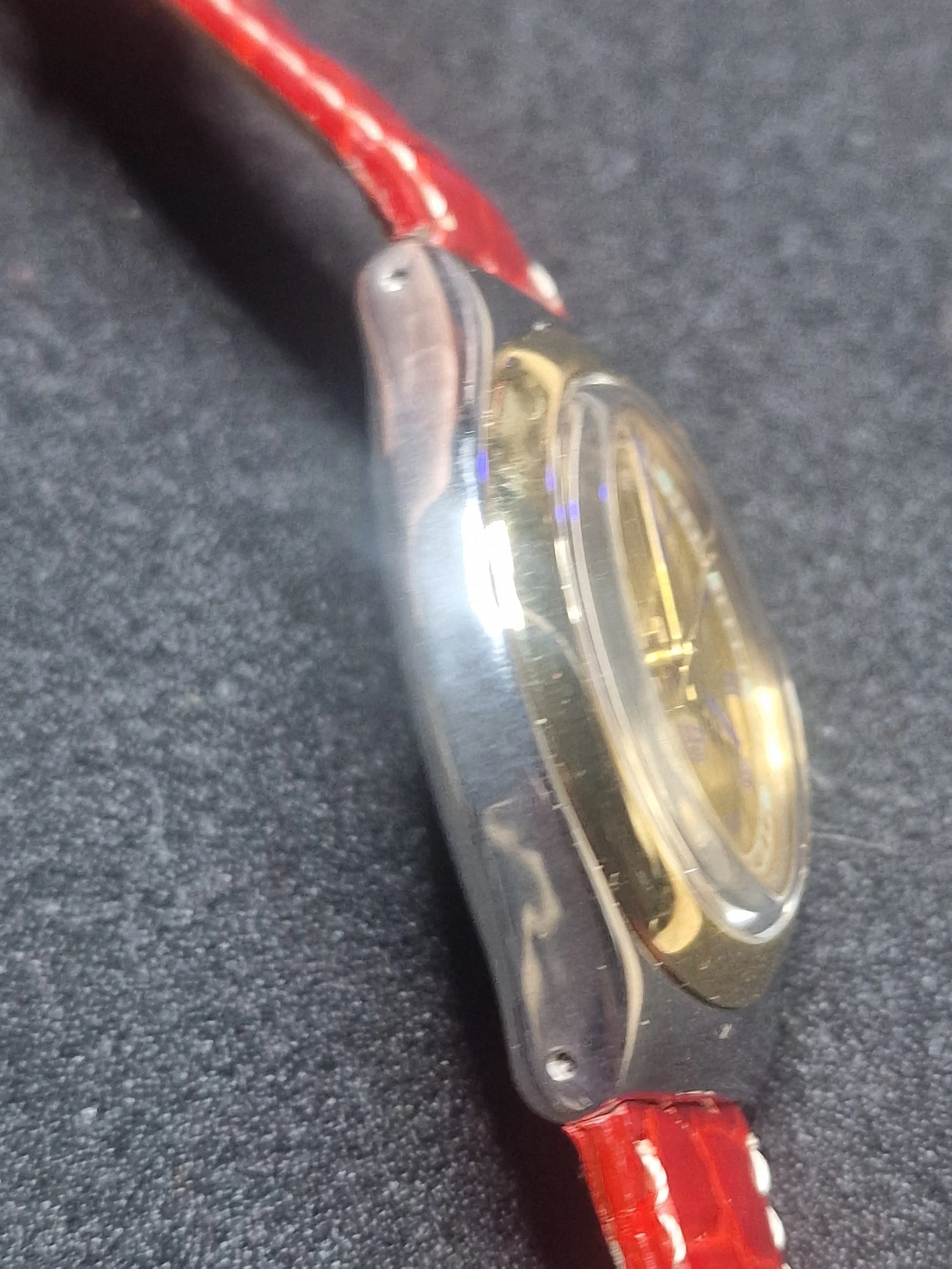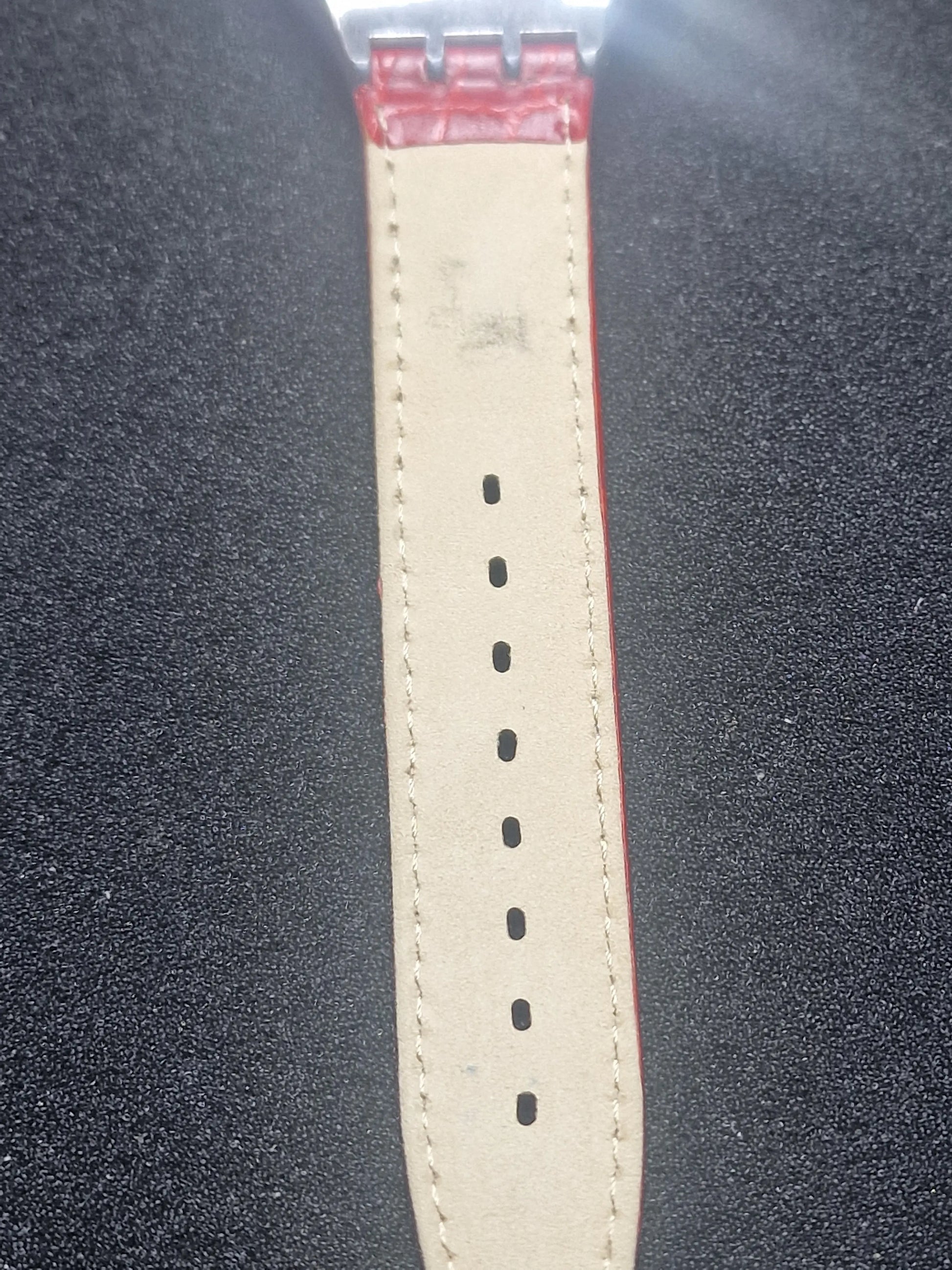 🔹 Strap: Red leather strap with Swatch buckle