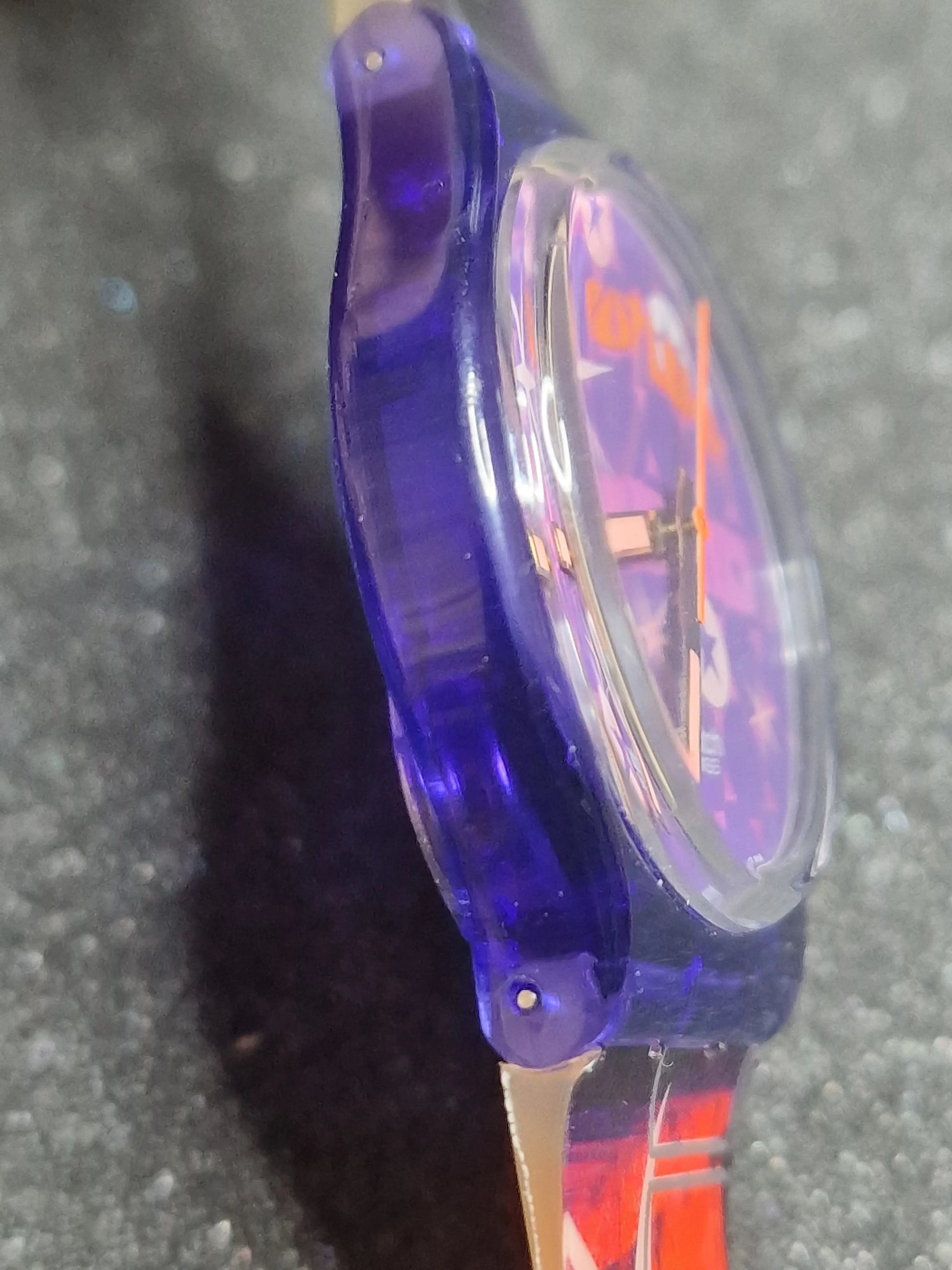 The Swatch GN901 “Potluck” (1996) features a deep purple translucent case, starry-pattern strap, and bold typography that glows under UV light.
