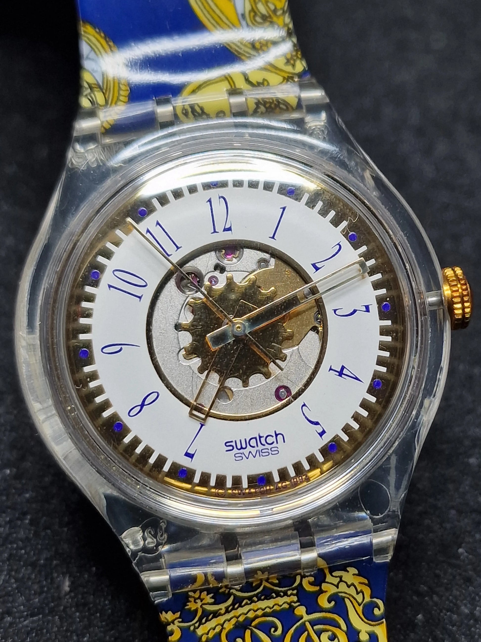 A beautiful model from the first generation of Swatch Automatics (1990–1993), the SAK106 “St. Peter’s Gate” is one of the most decorative and symbolic designs of the early 90s.