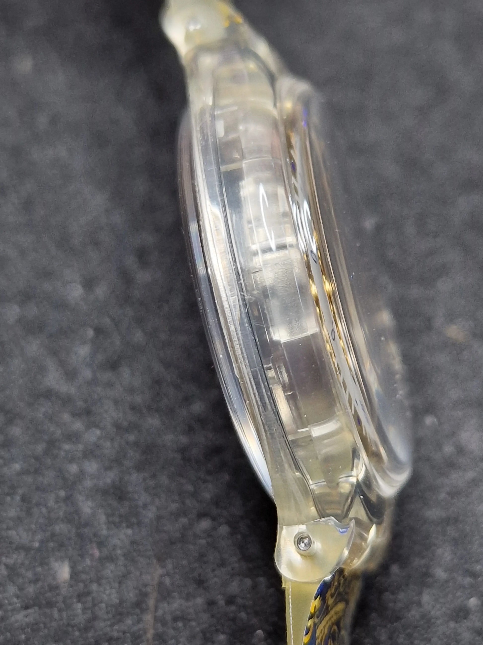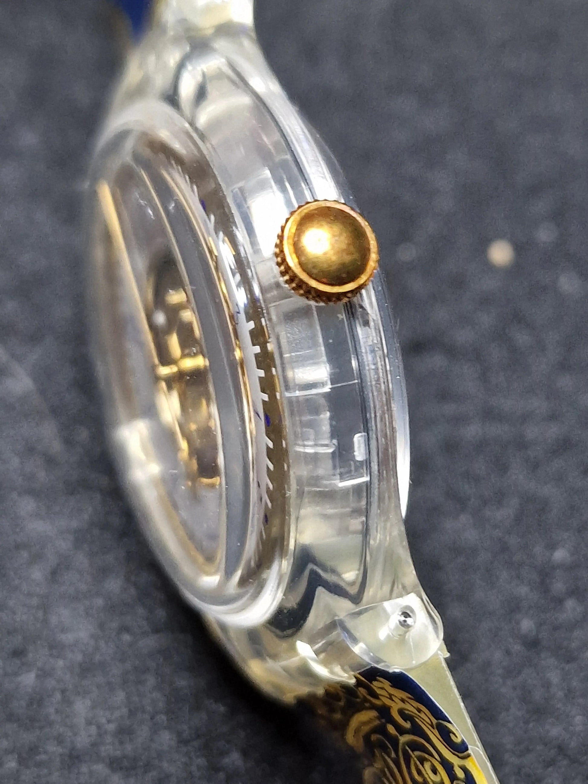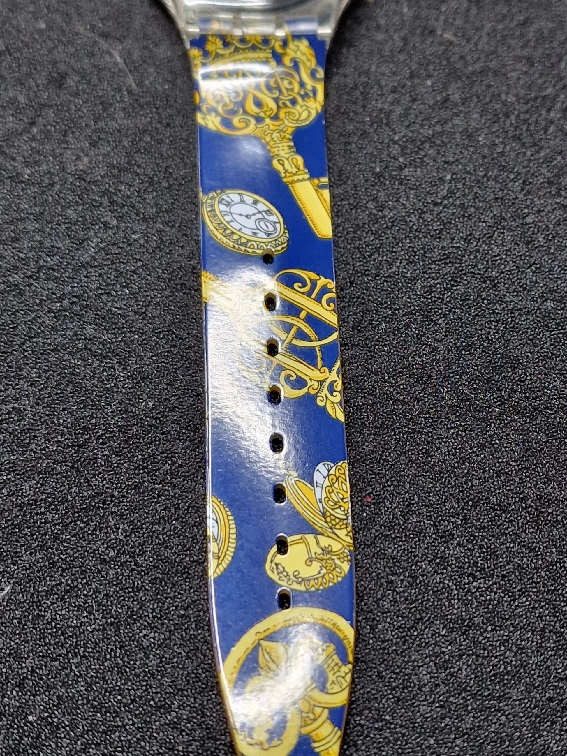 Strap: Blue plastic strap with baroque/renaissance-inspired motifs (clocks, keys, ornaments) in golden print