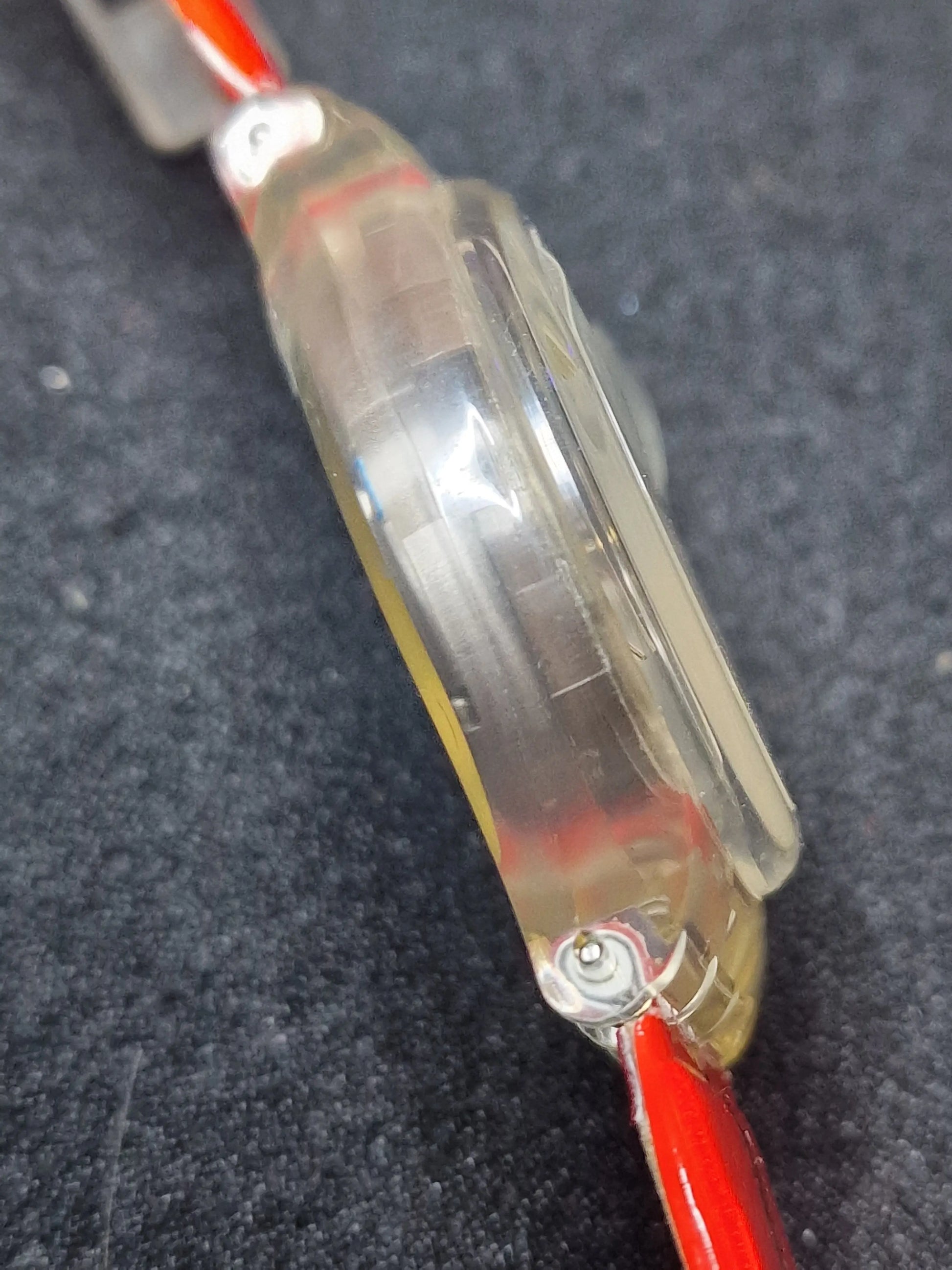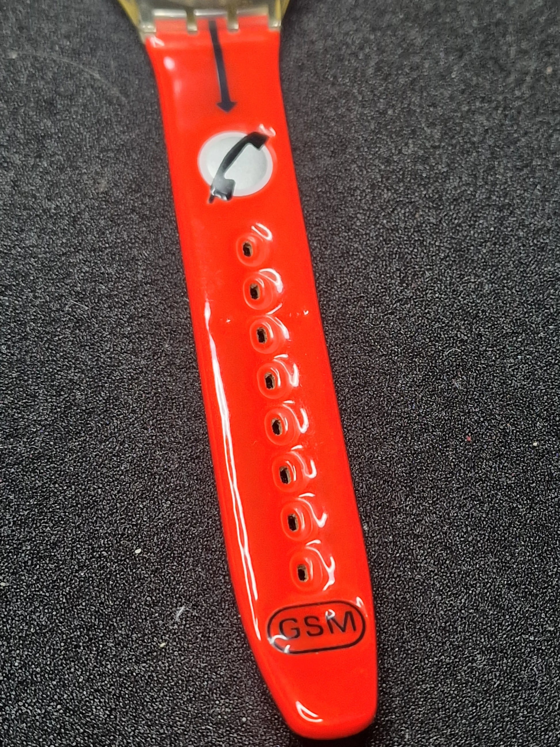 Strap: glossy red strap with printed graphics (100 minutes to talk), signed d!ax (Swiss mobile operator, special edition)