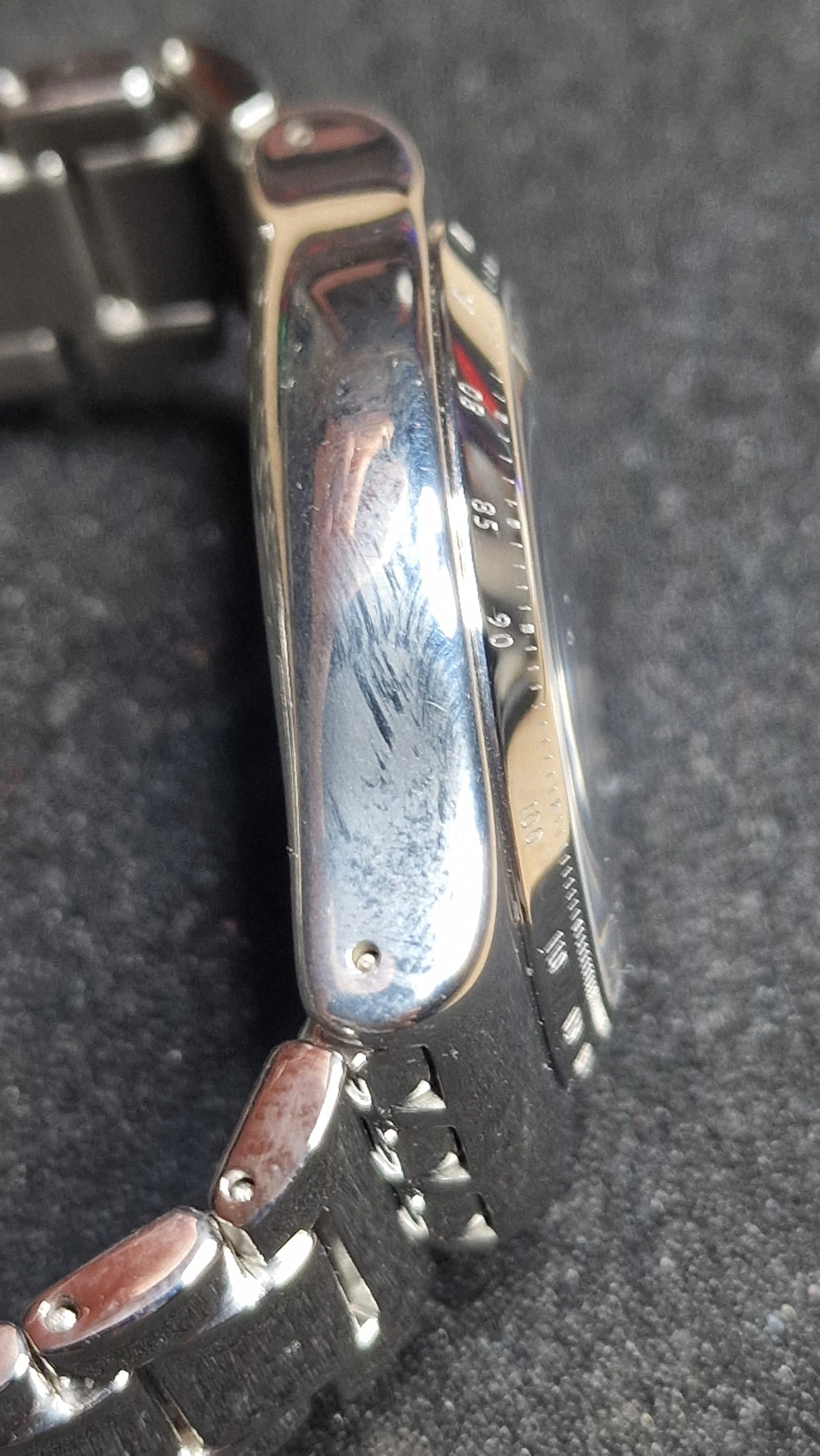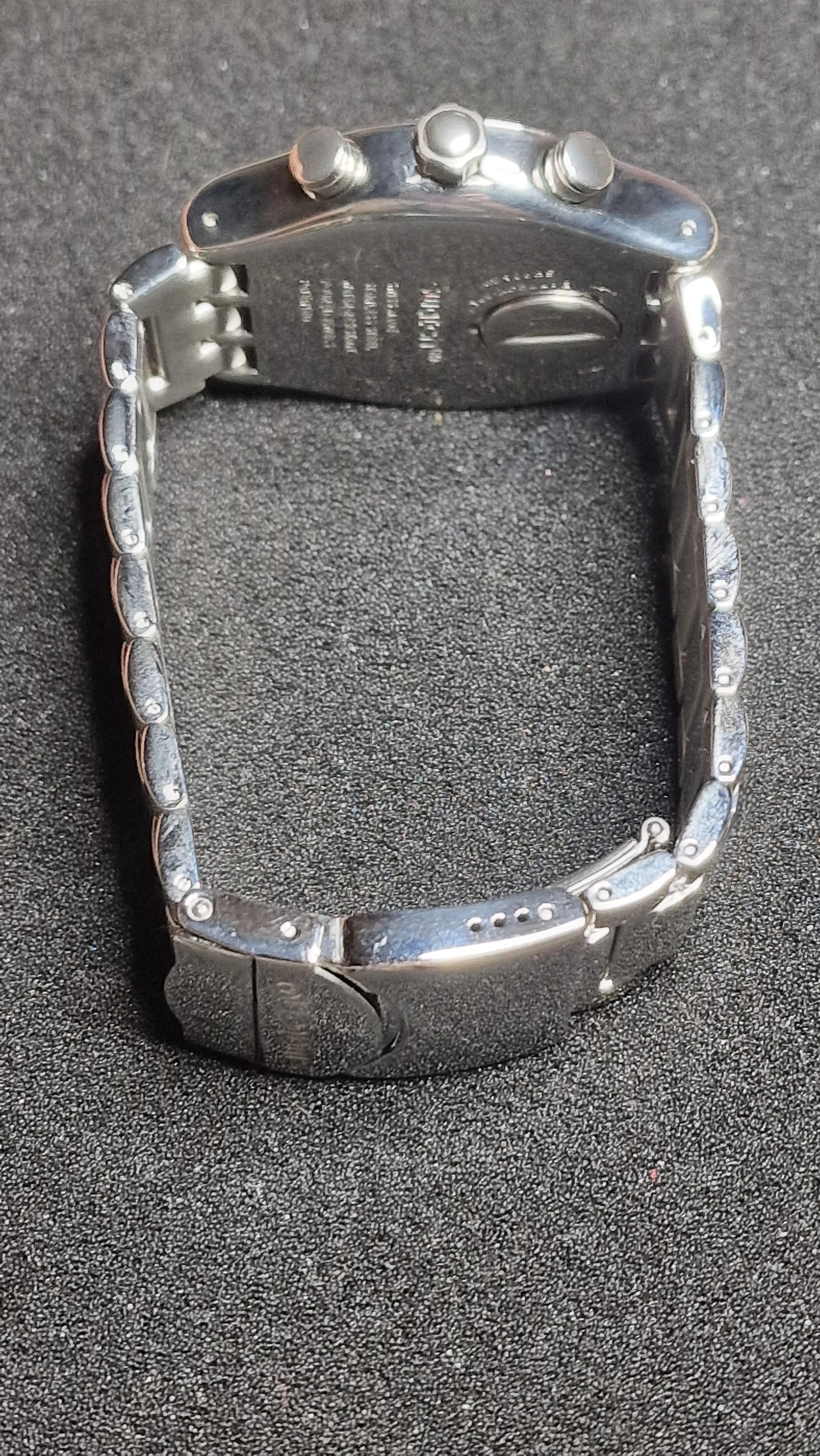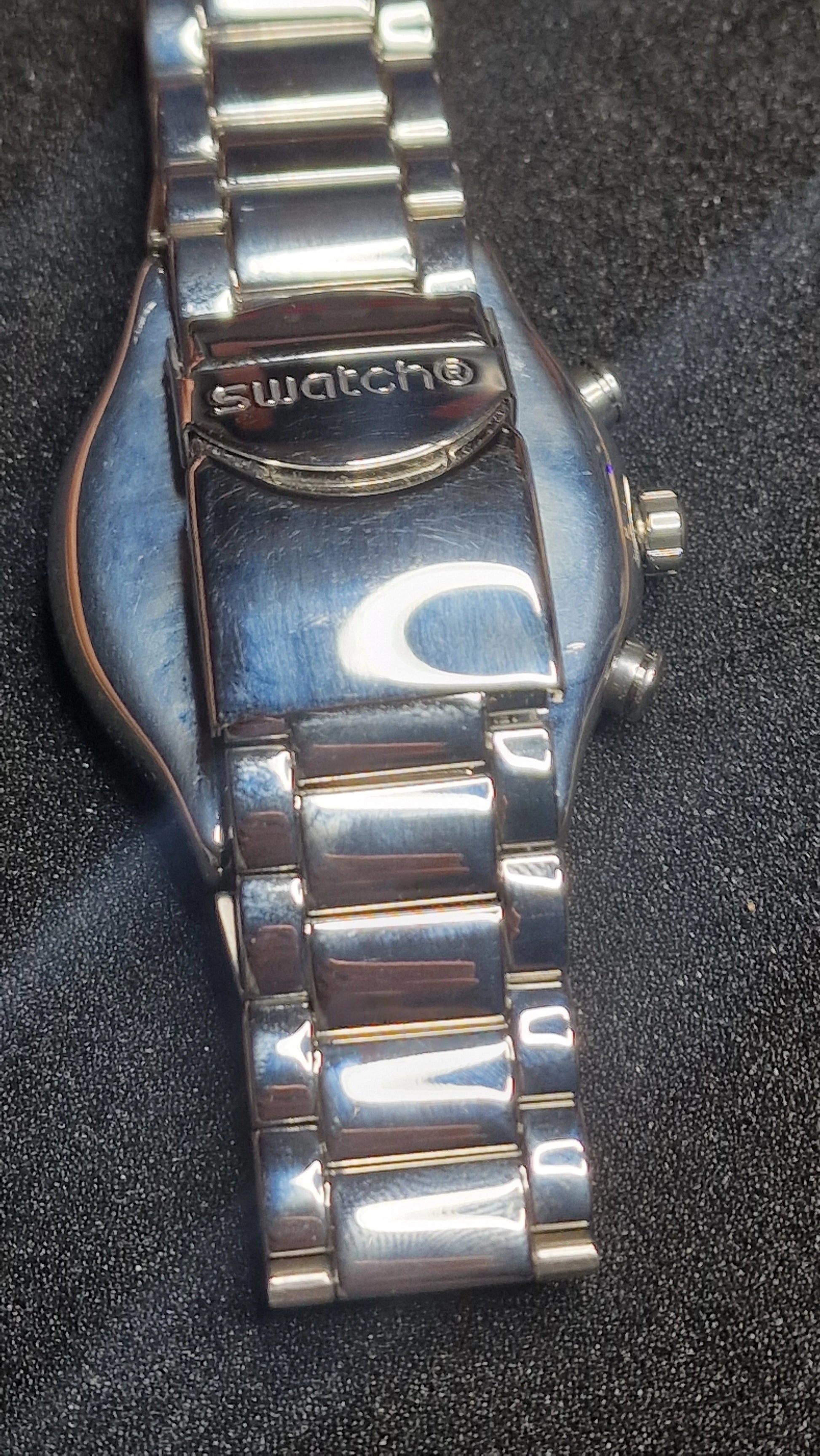 Fresh, clean and super wearable: this original Swatch Irony Chrono “SKY ICON” from 2018 combines a stunning ice / sky-blue sunburst dial with deep blue subdials, a sporty tachymeter bezel and a solid stainless-steel bracelet.