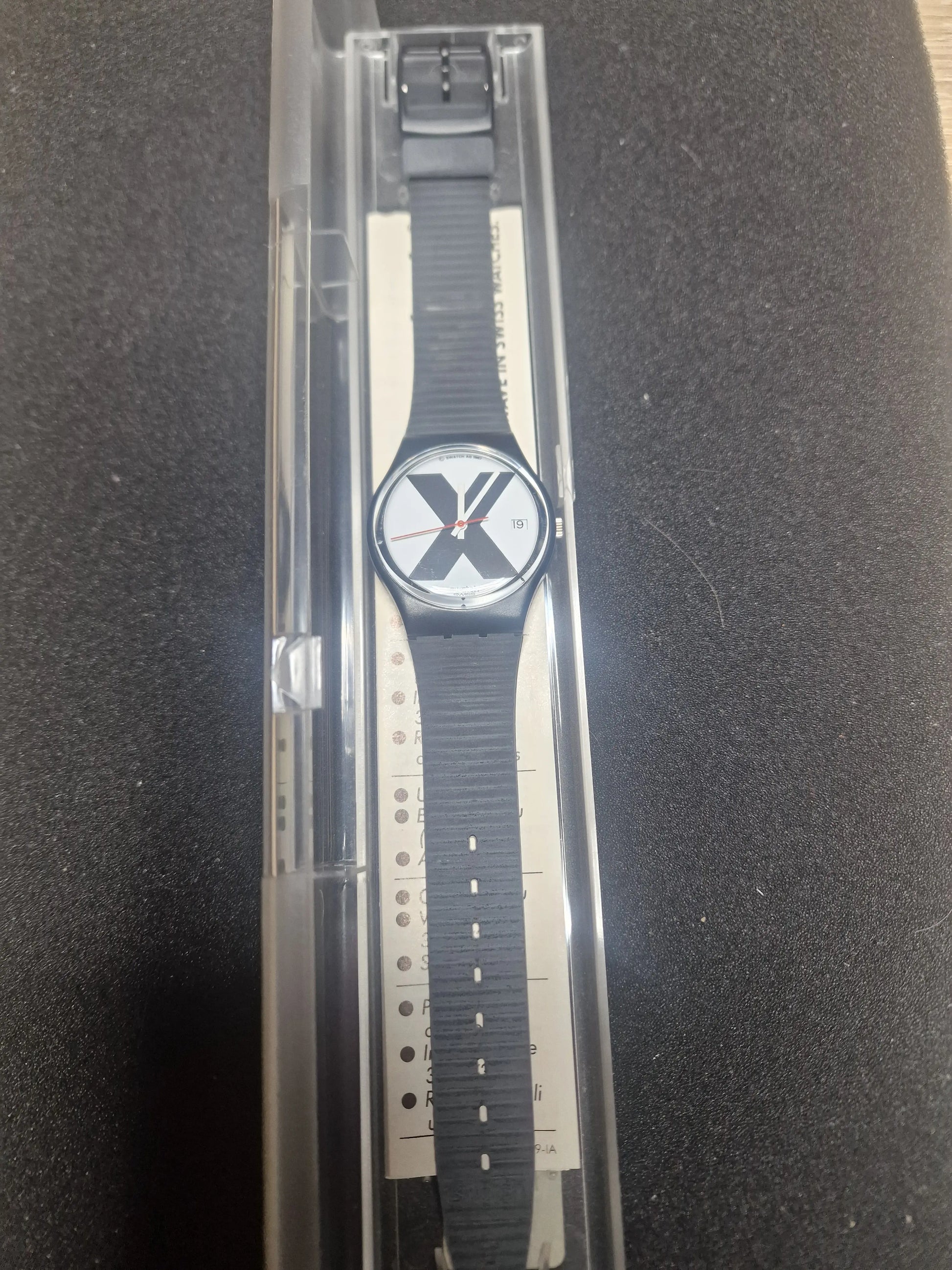 The striking black & white “X” dial with contrasting red second hand is a true conversation piece and one of the most sought-after vintage Swatch models.