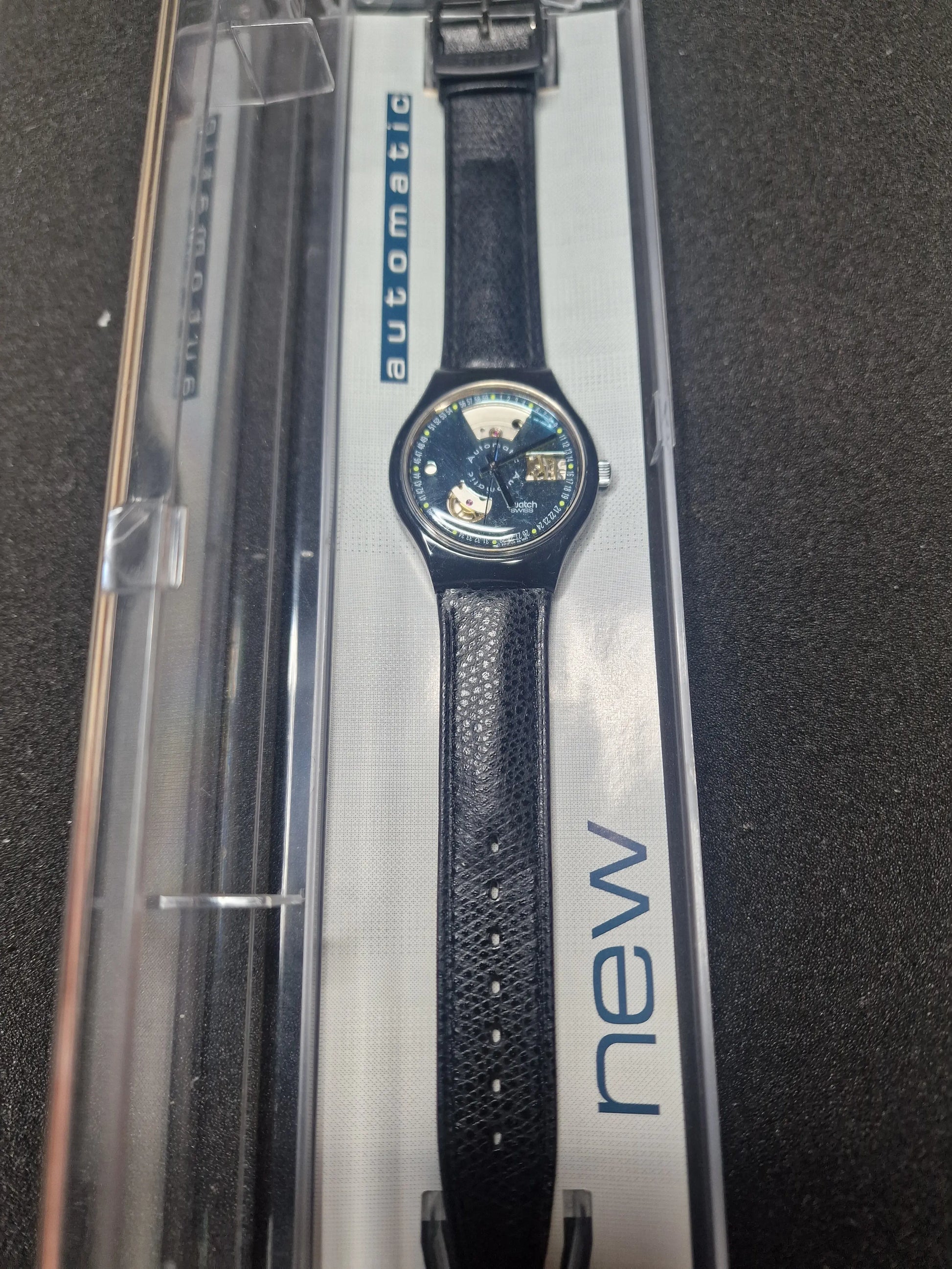 An iconic piece from the very first generation of Swatch Automatic watches (1990–1992). The SAB100 “Black Motion” is one of the most sought-after early automatics, known for its minimalist yet striking skeleton design.