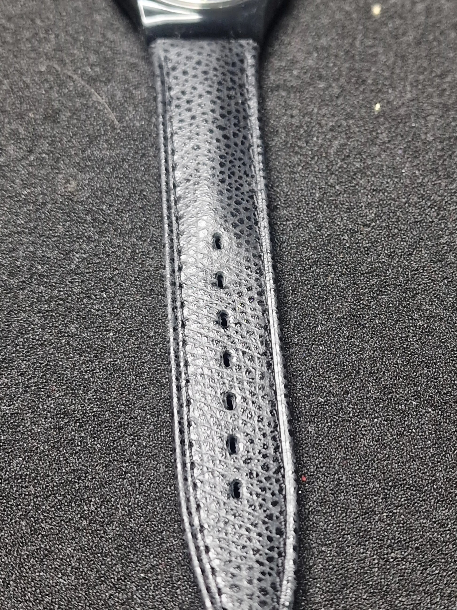 Strap: Black leather strap with embossed pattern