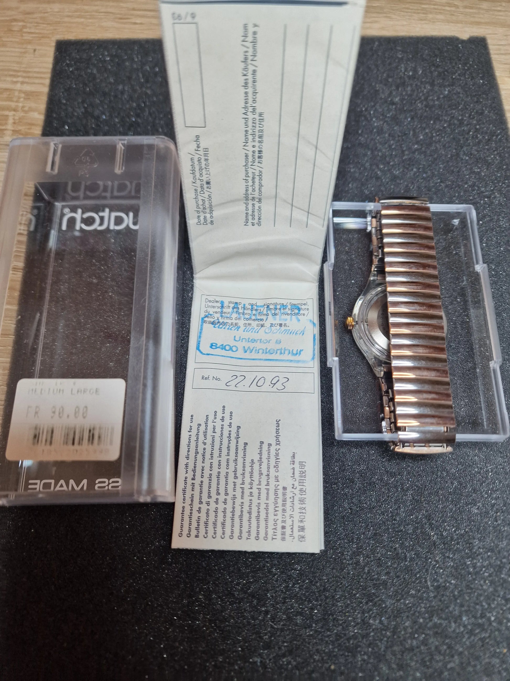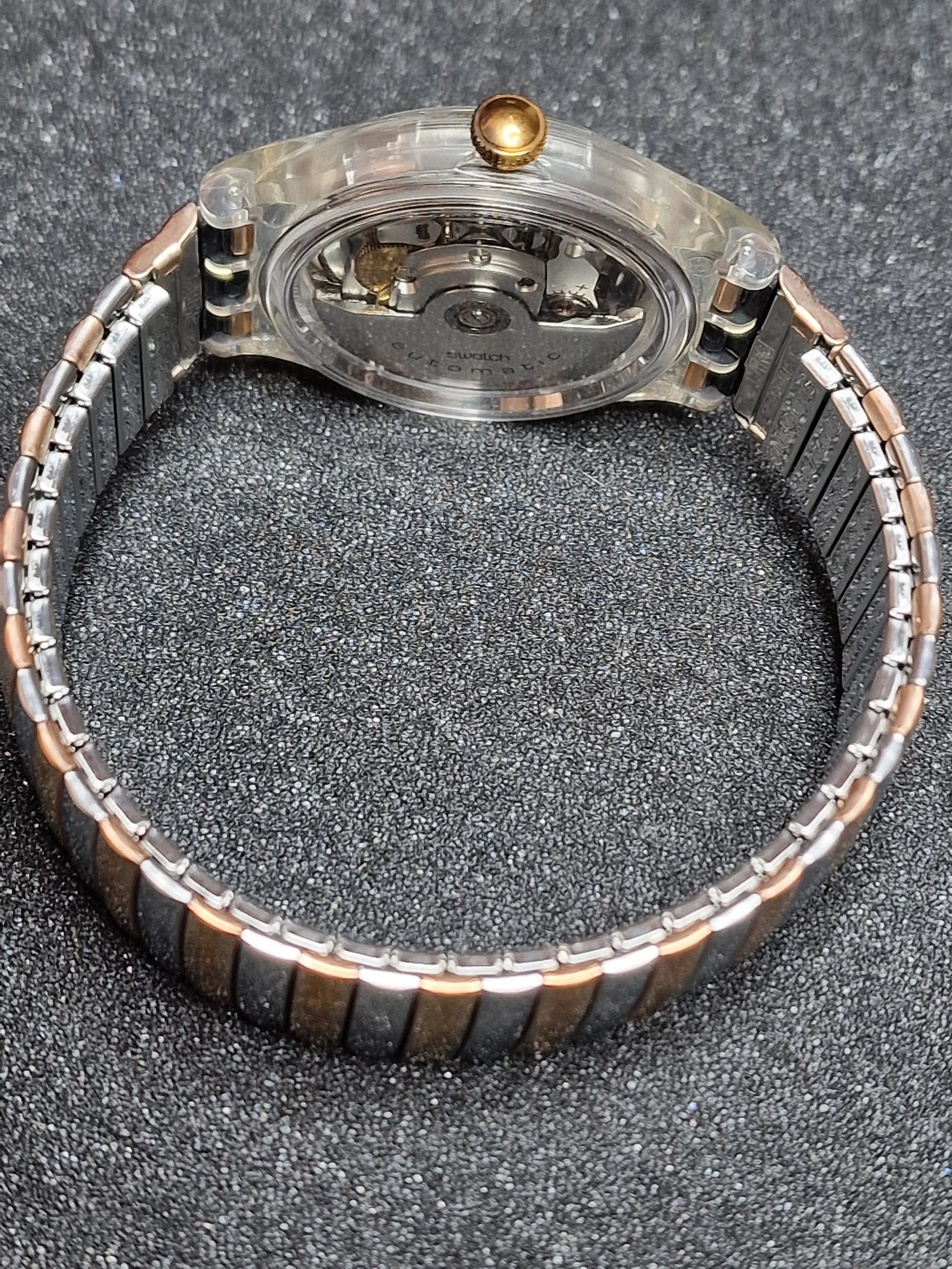 ✨ This model is highly sought after by collectors thanks to its skeleton dial and the bold copper-gold design, which embodies the Swatch spirit of the 90s.