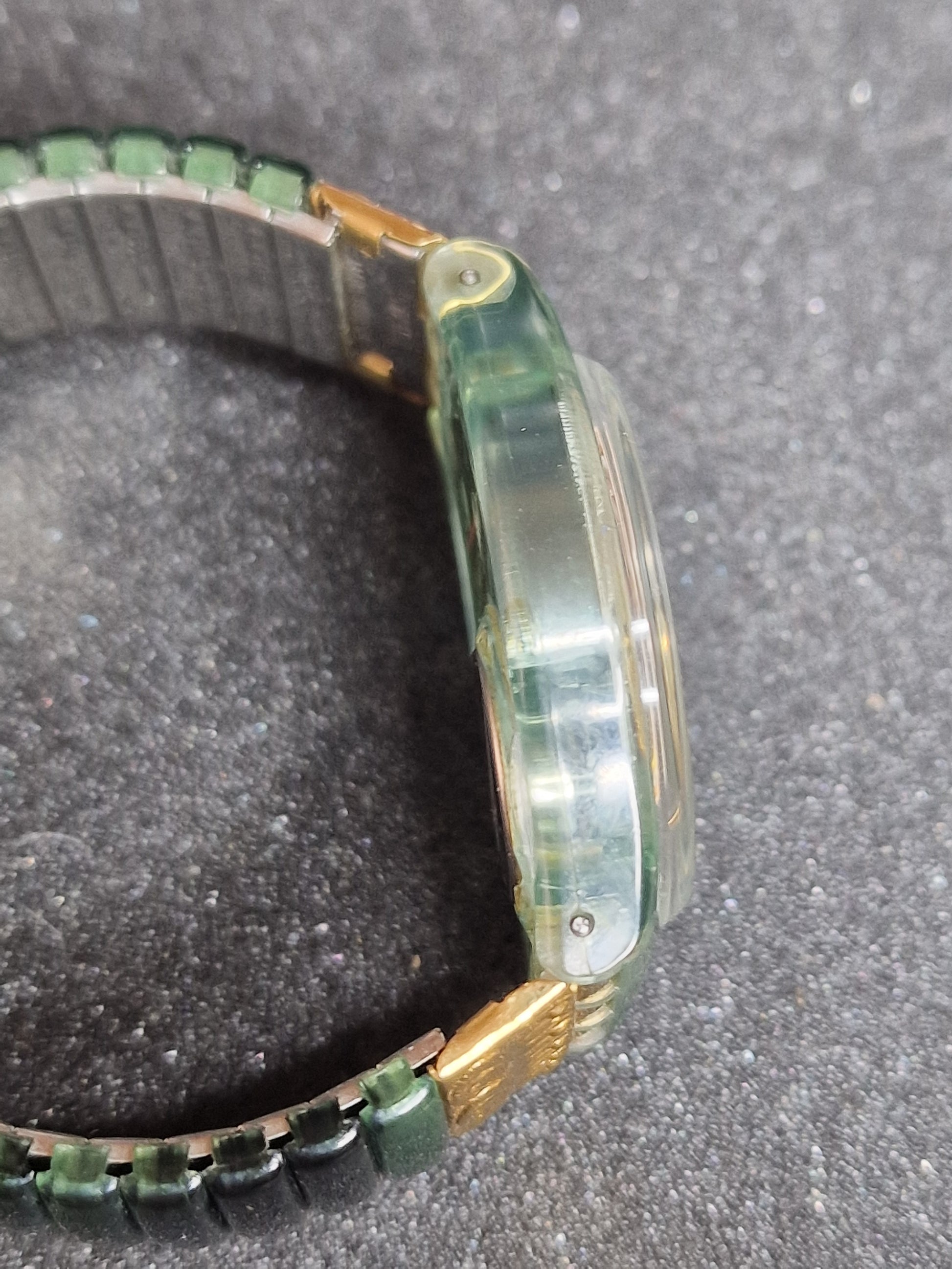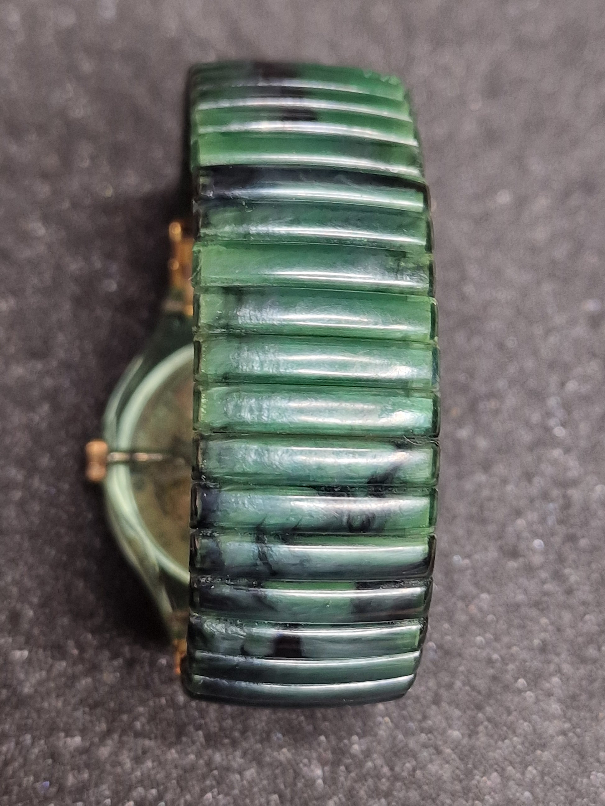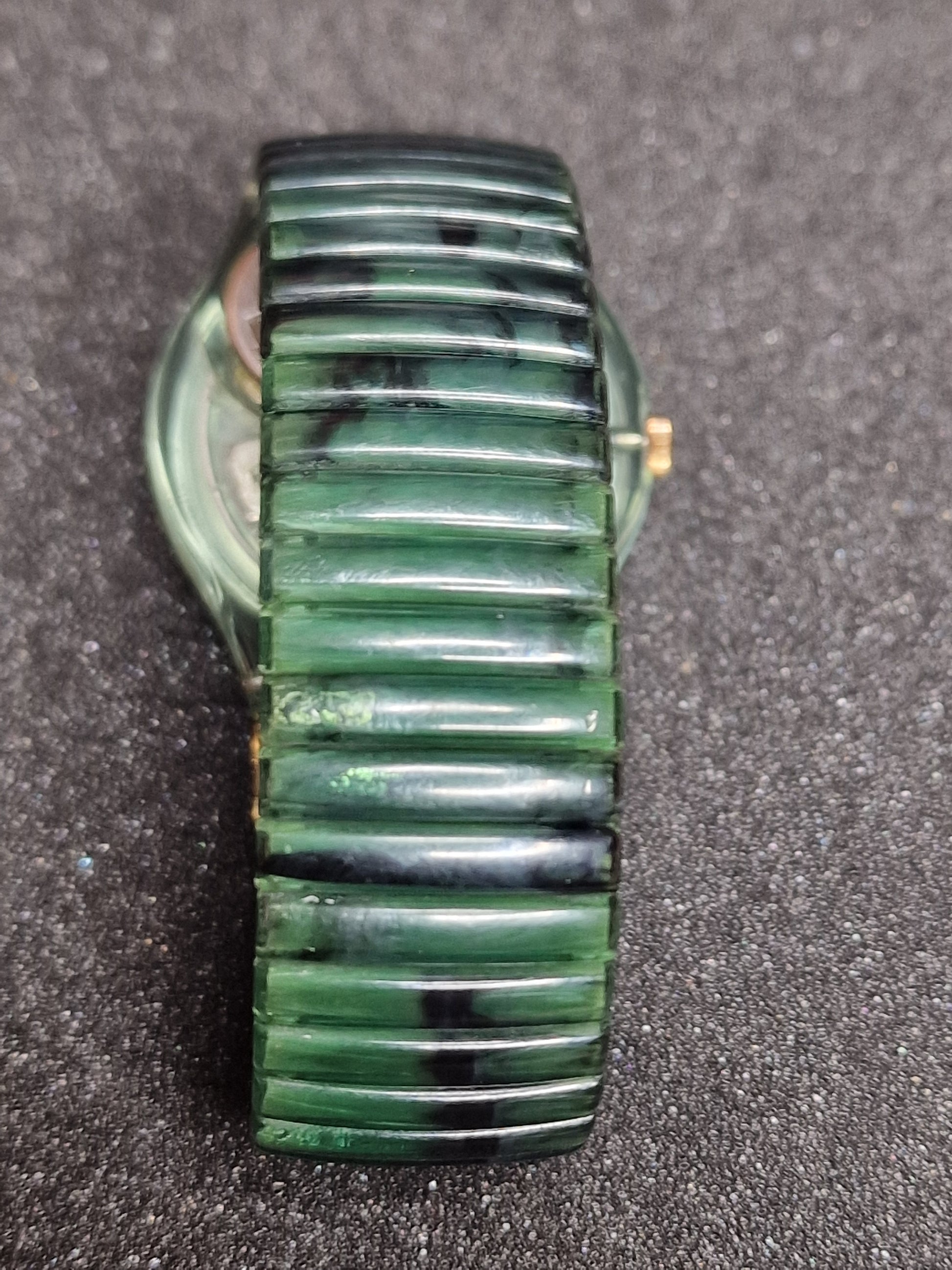 A beautiful Swatch Flex from 1997 – model GG171 “Jade”, featuring a unique jade-green dial with golden oriental-style motifs.