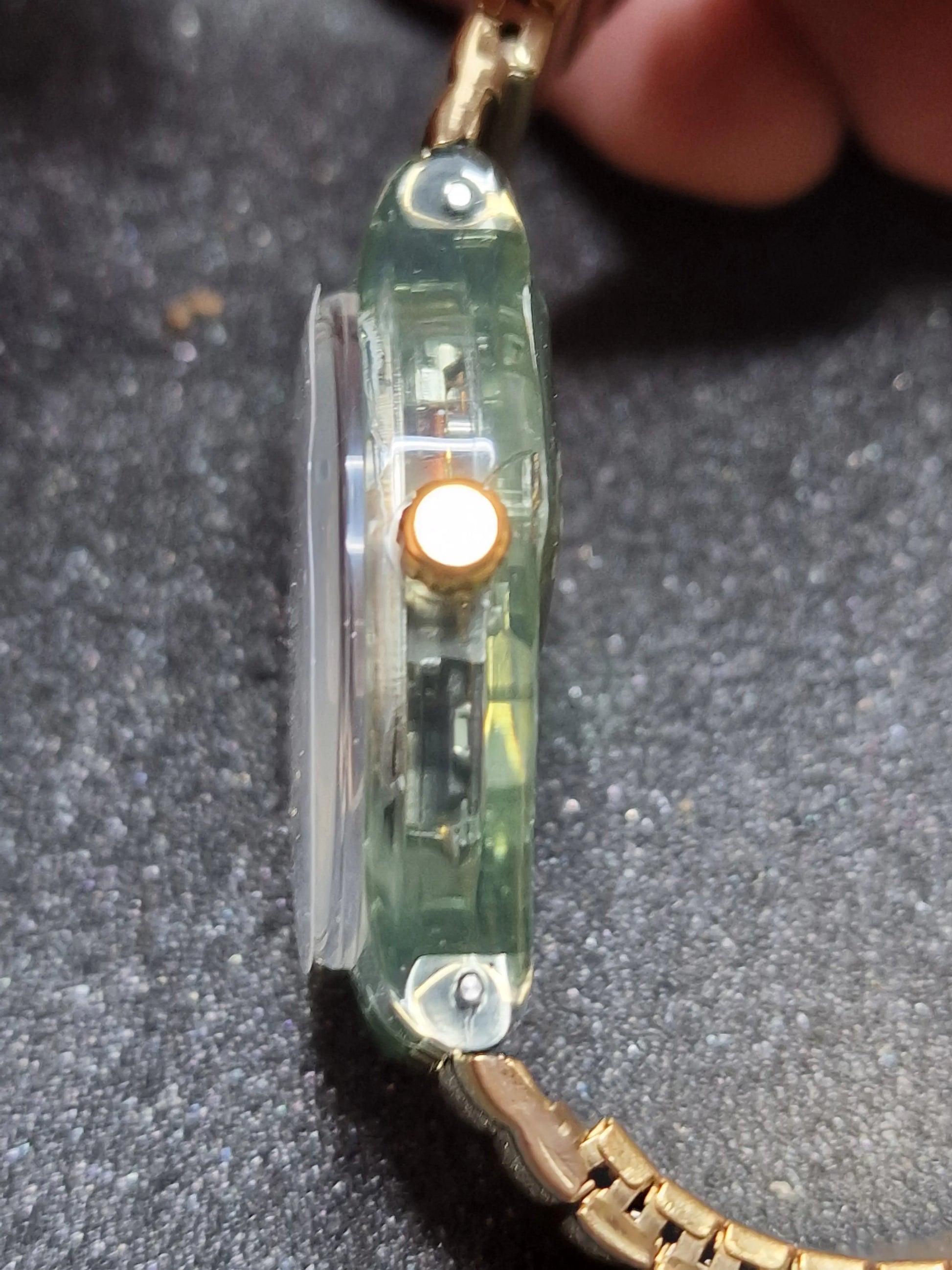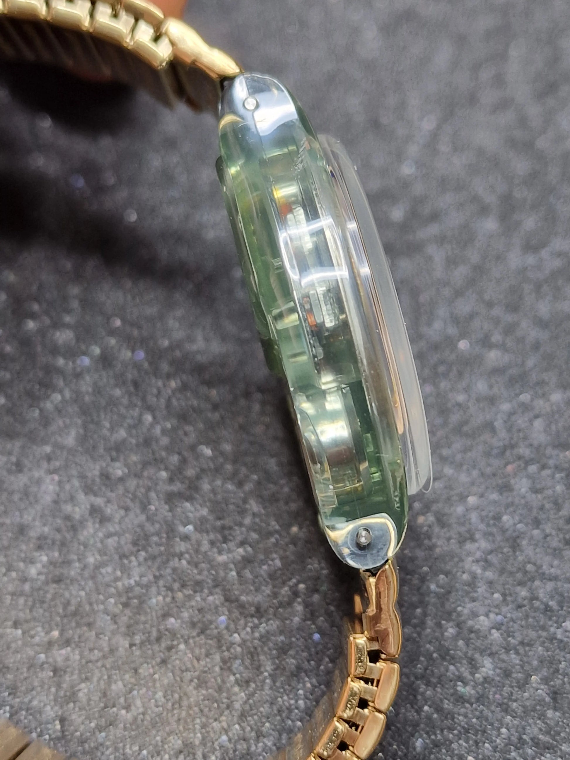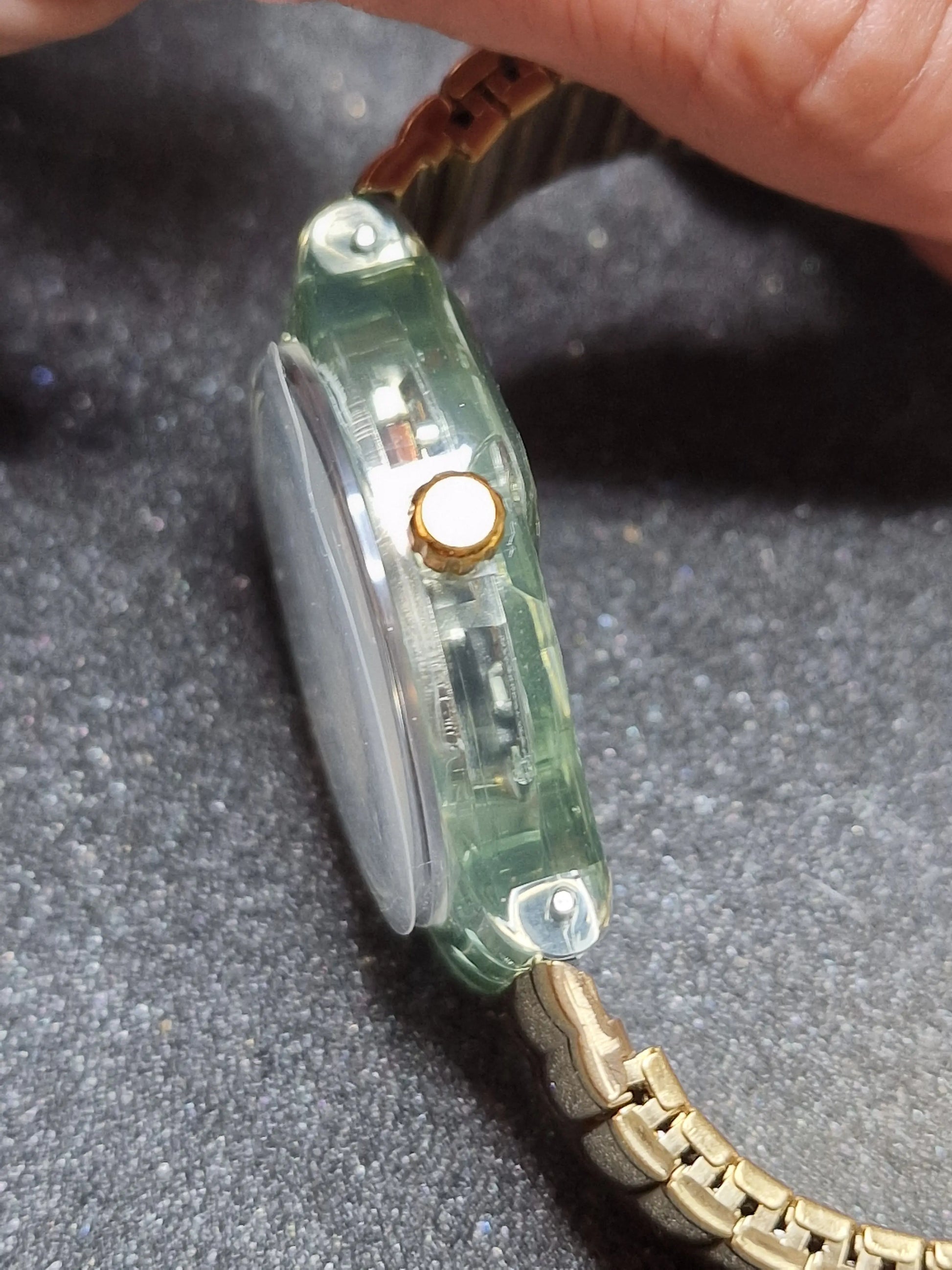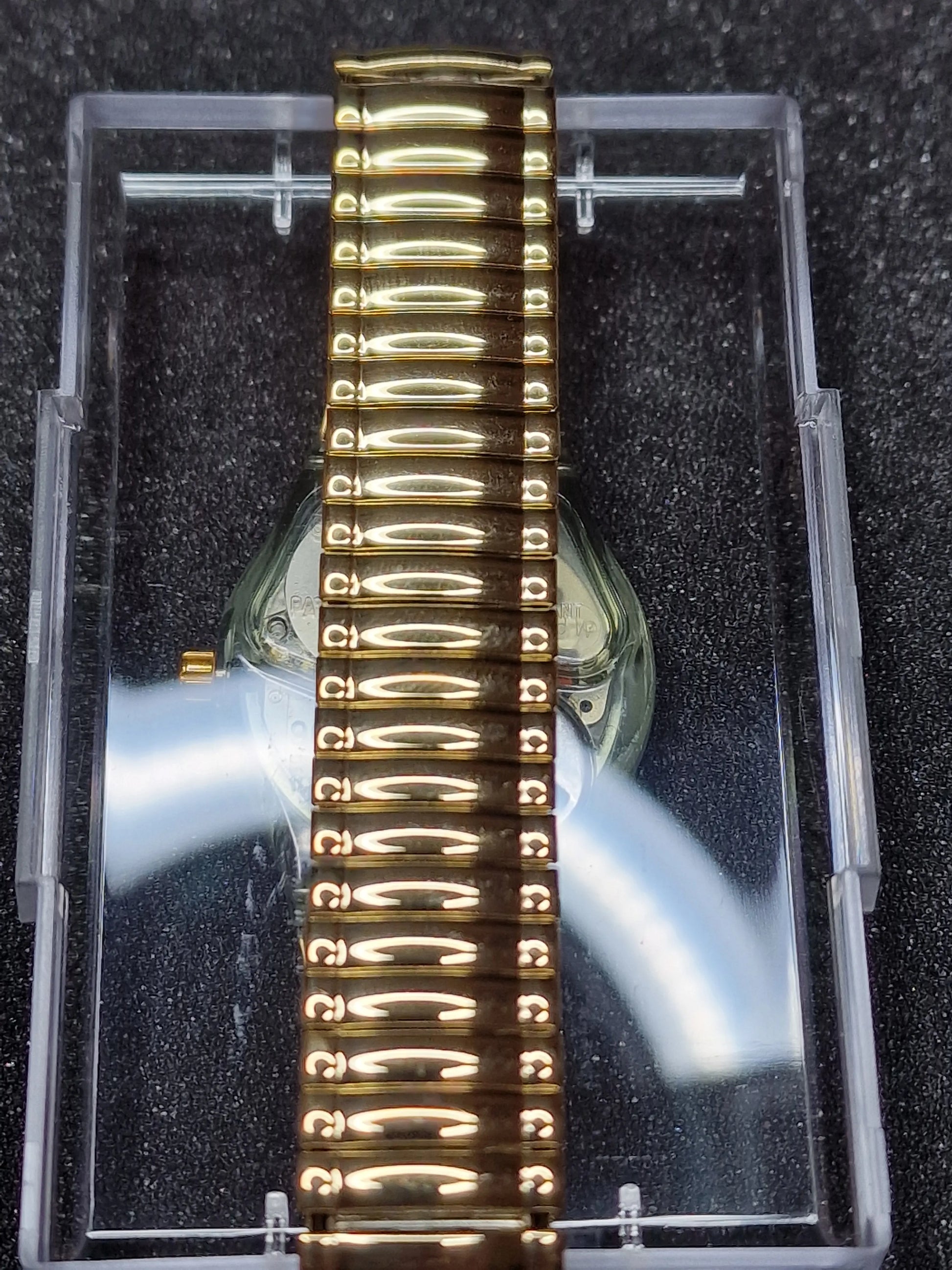 🔹 Bracelet: Original Flex Gold tone strap (marked “Swatch” inside links)