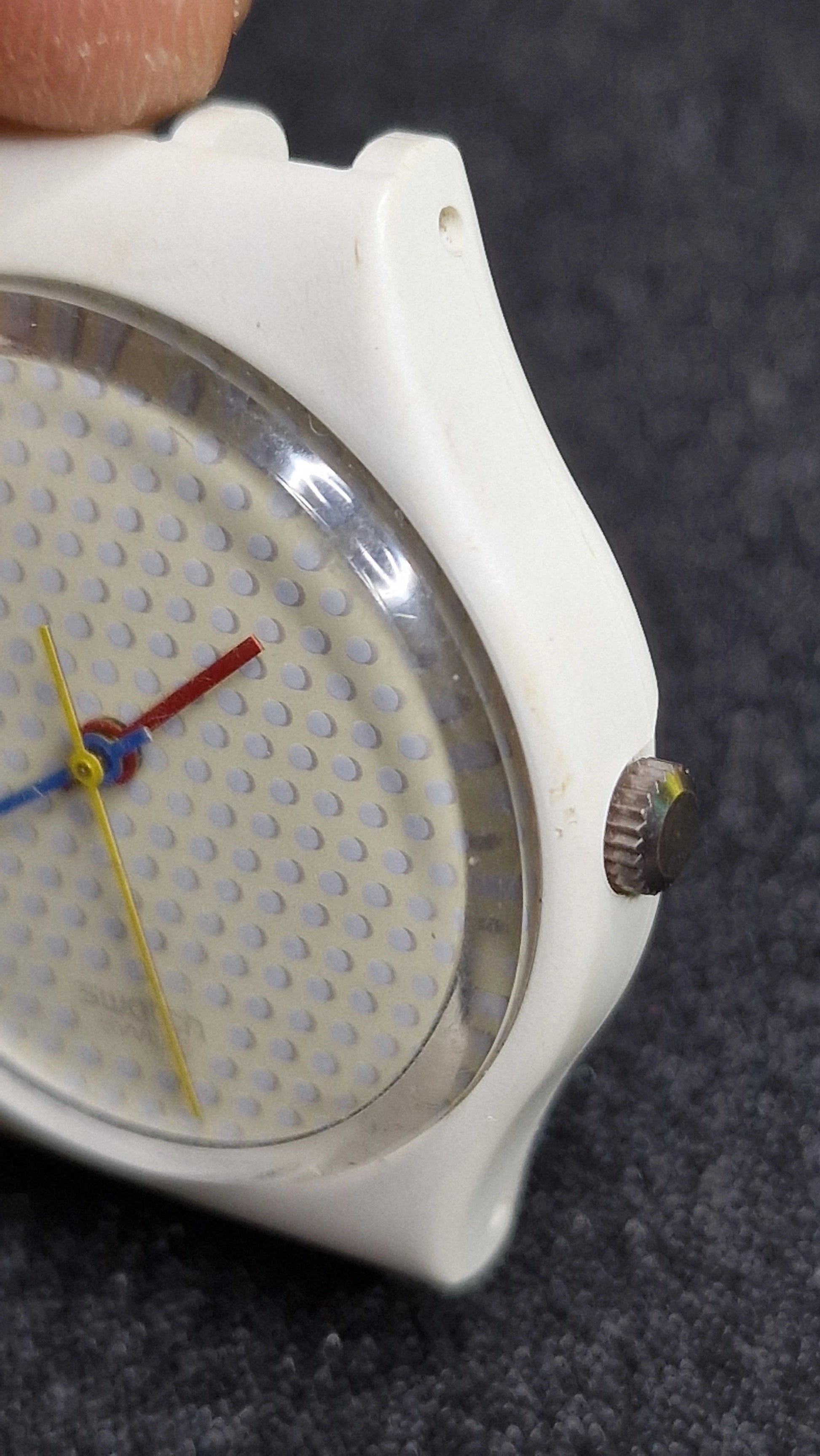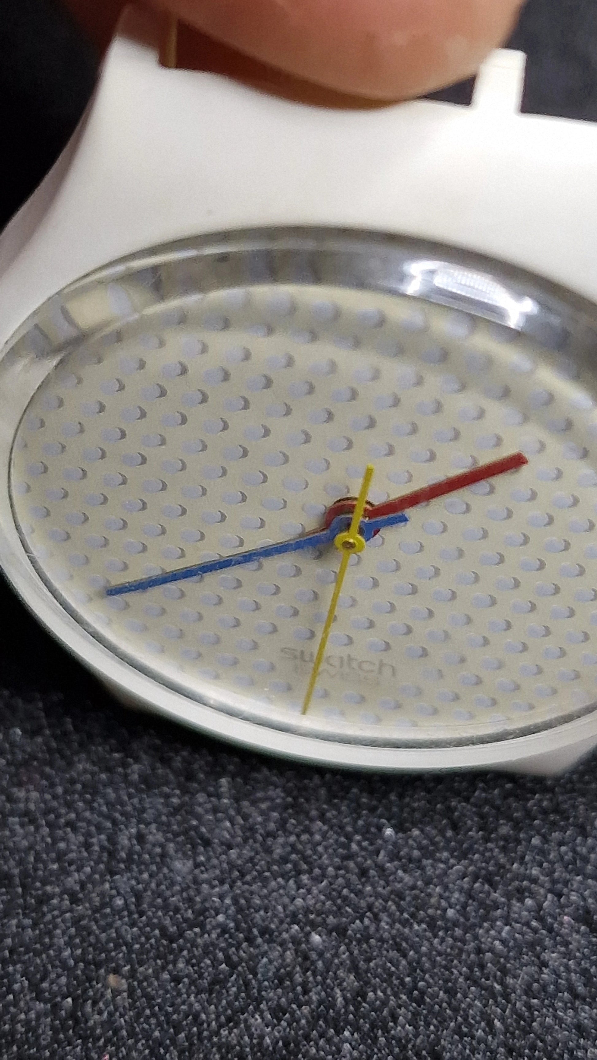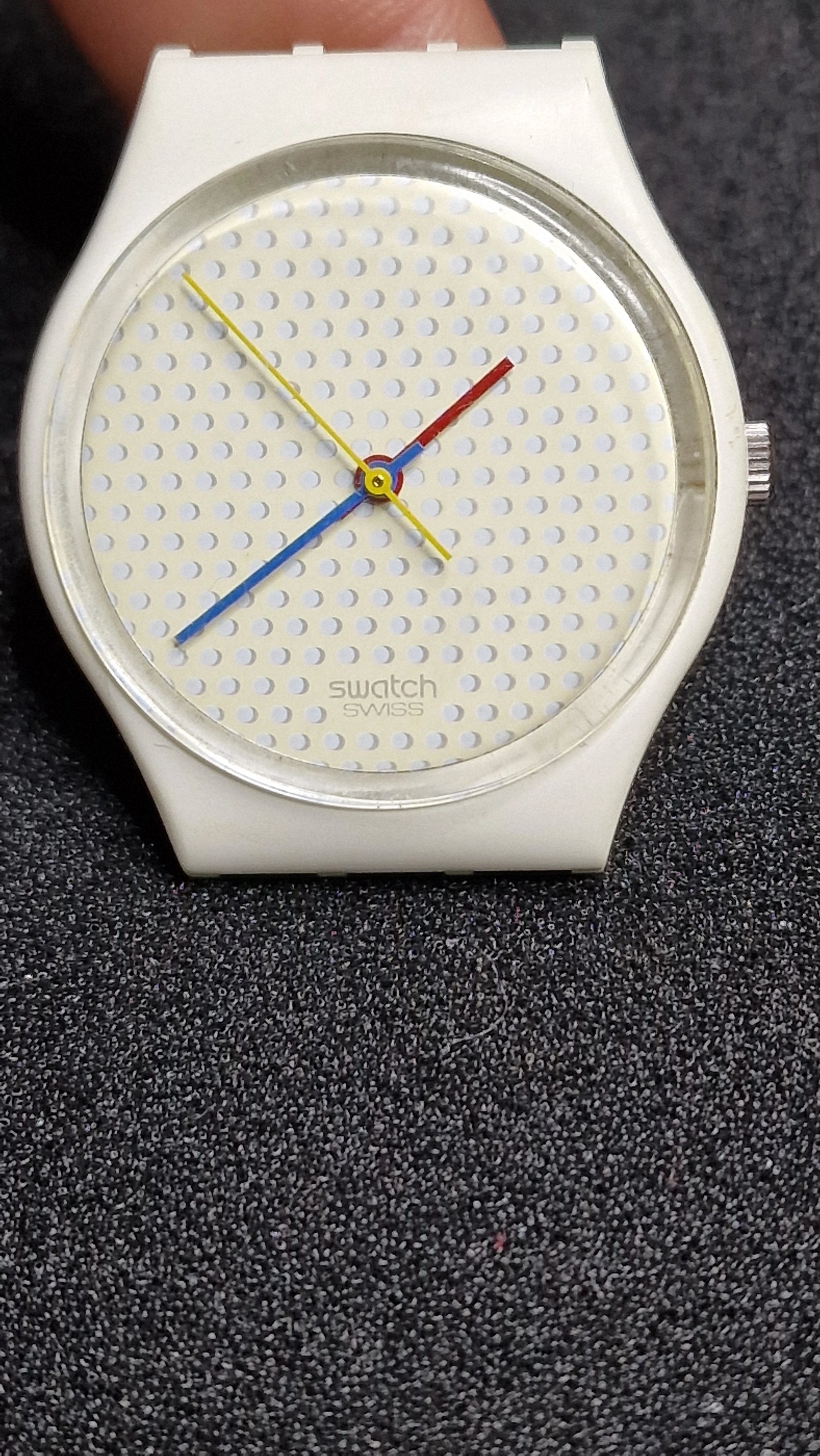 Iconic 80s Swatch design with a “ping pong ball” style dial: white dotted texture, bold primary-color hands, and clean minimalist vibe. Great everyday vintage piece or collector addition. 😊👍