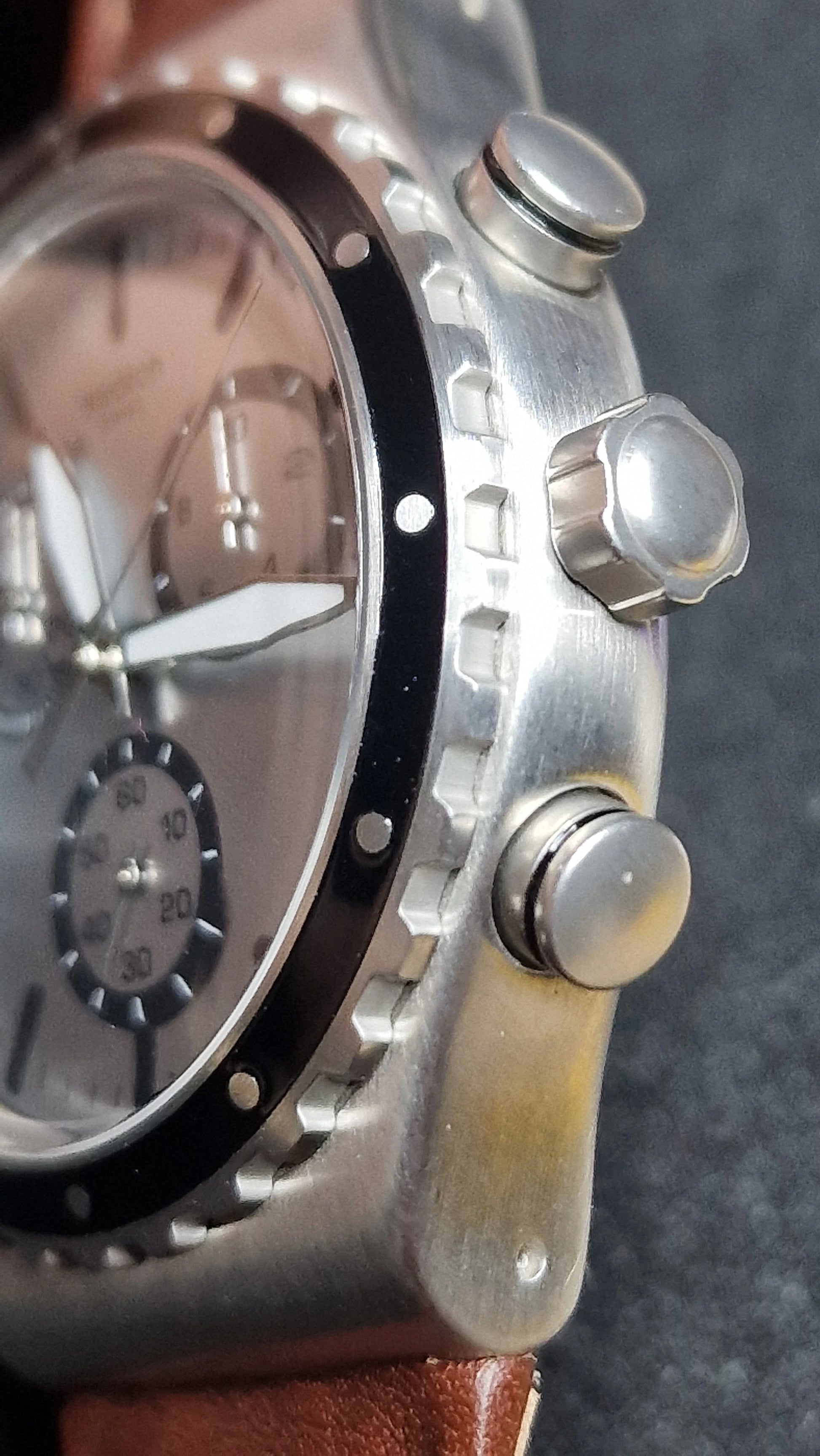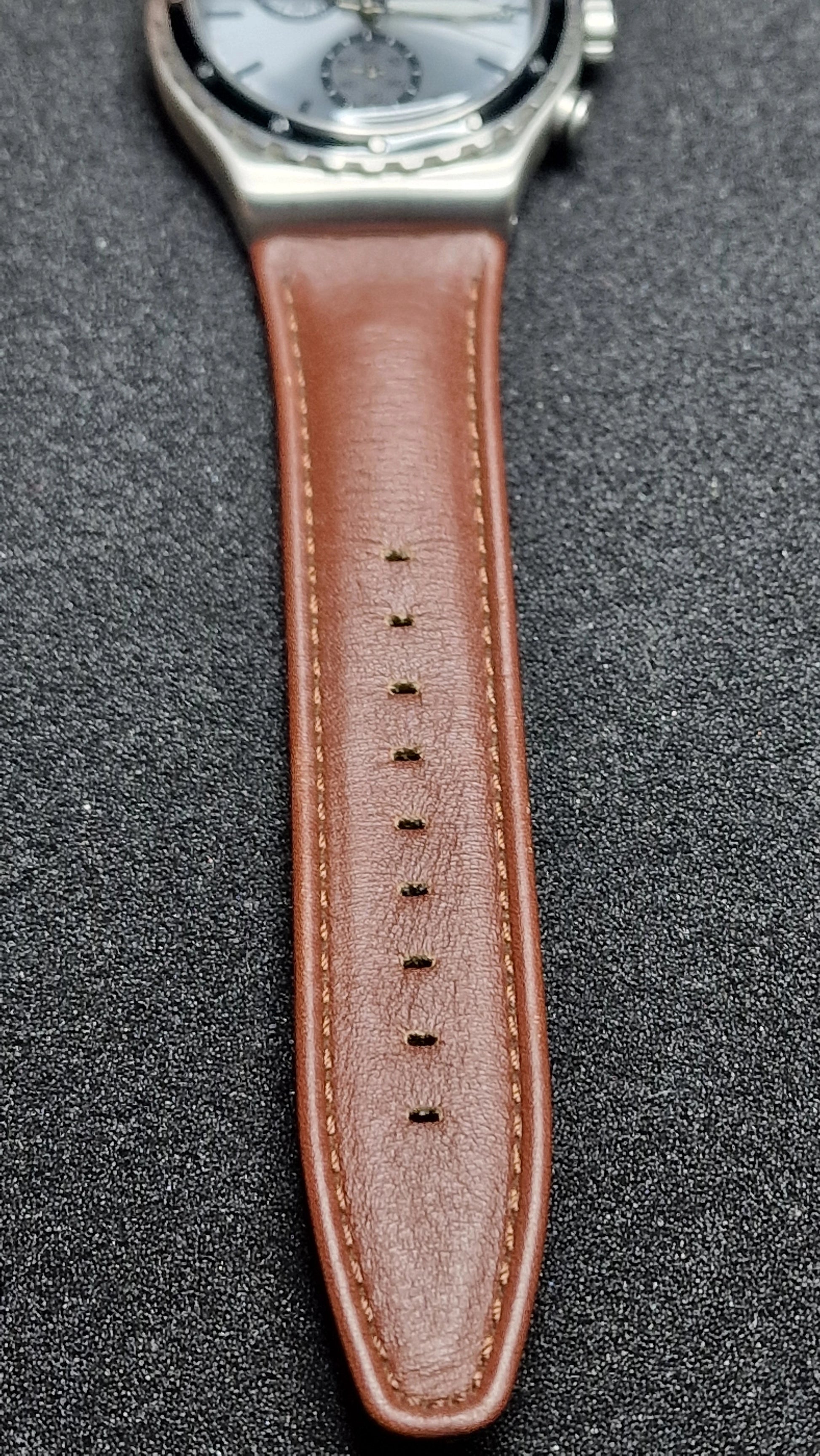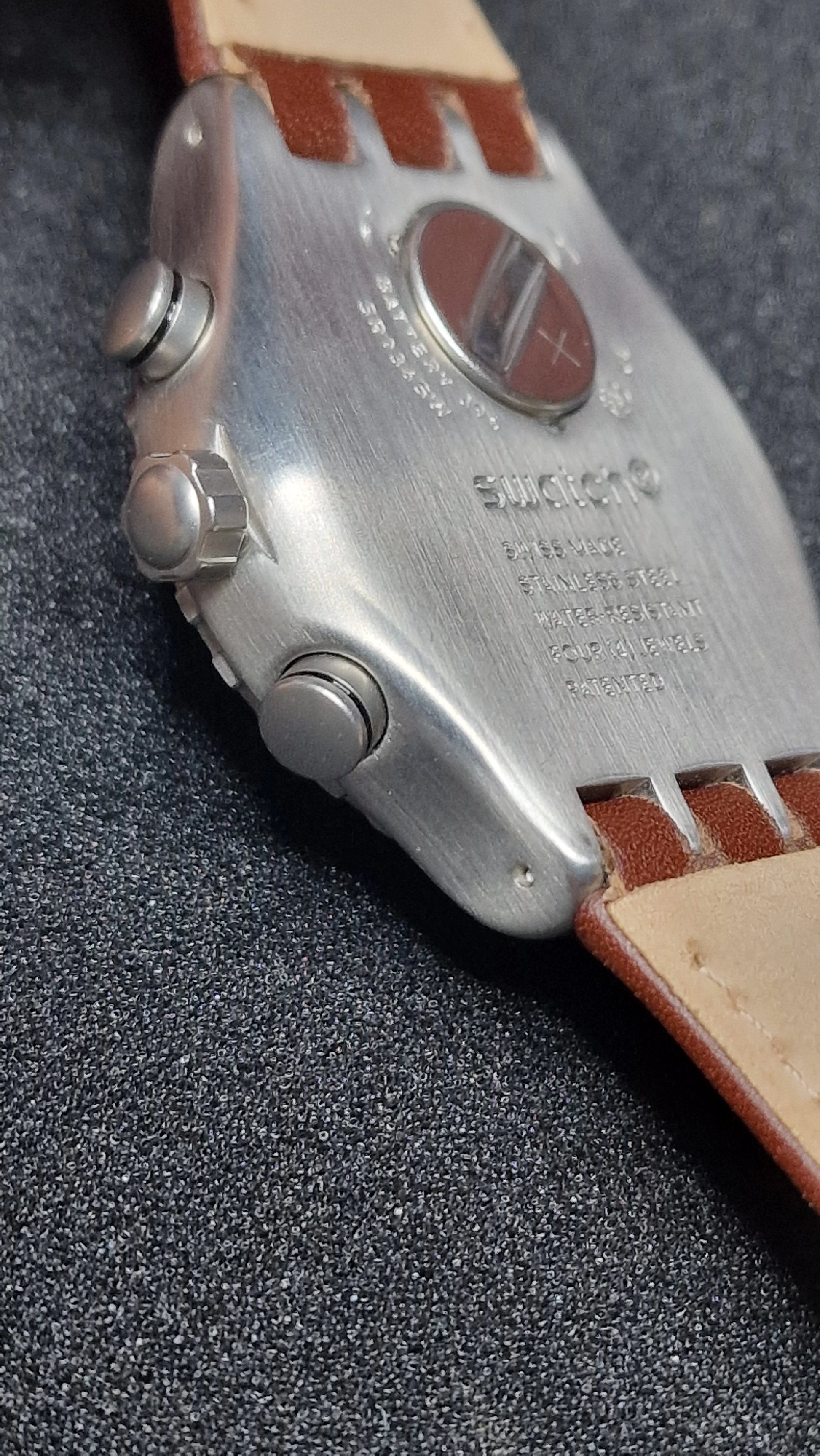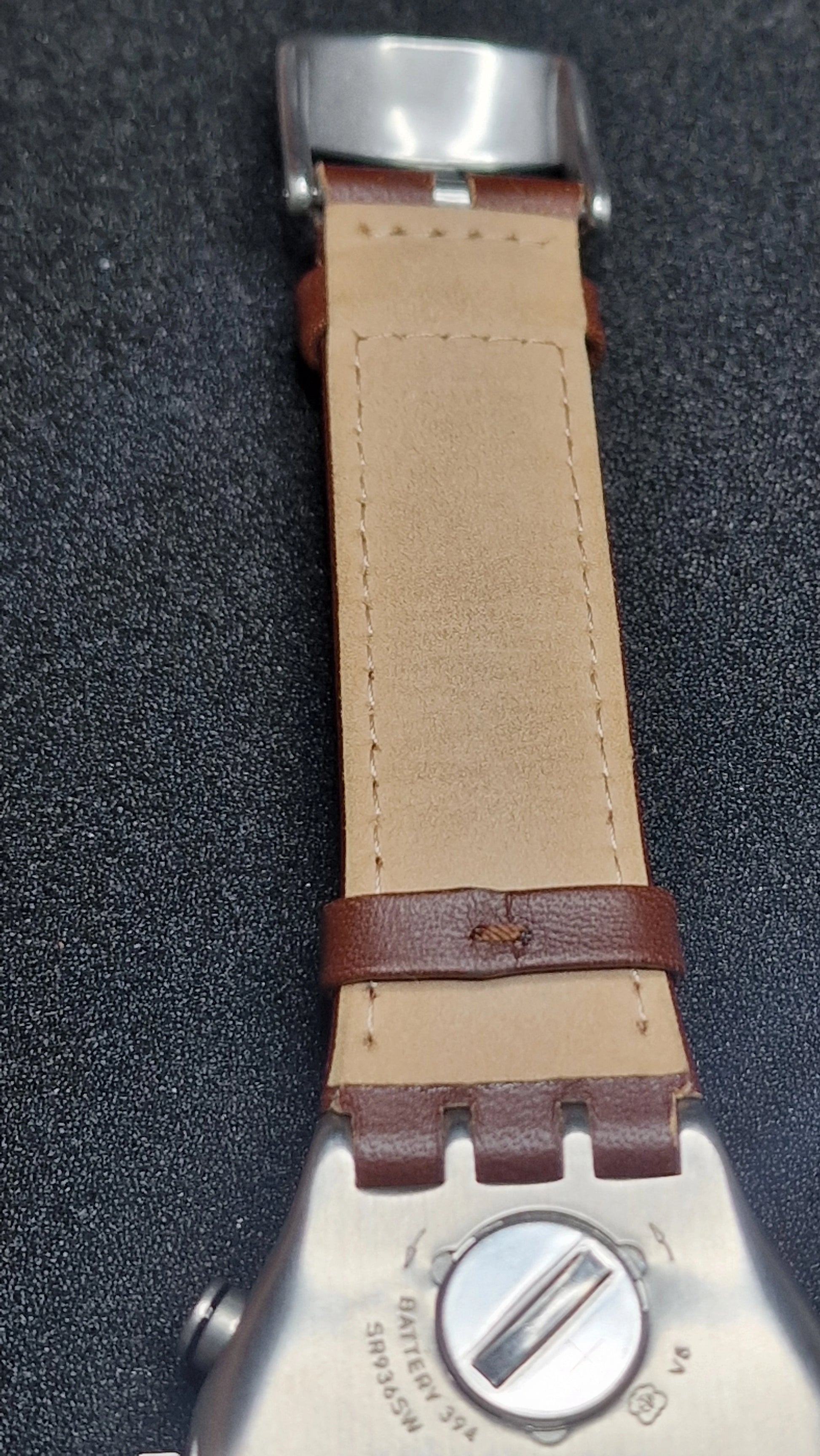 • For sale is an original Swatch Irony Chronograph with silver sunburst dial and a clean, sporty look on a brown leather strap.