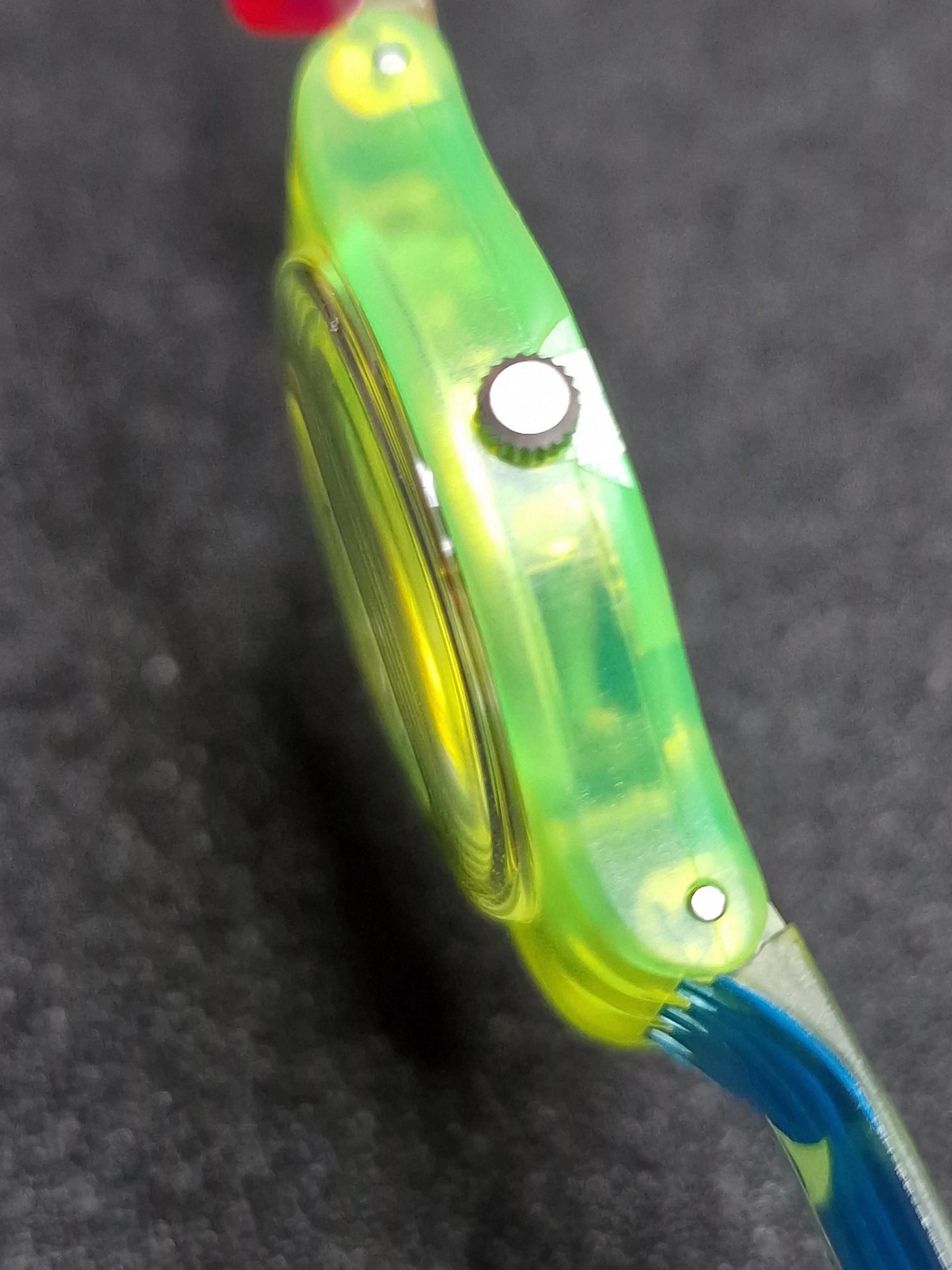 • Transparent green case with blue, pink, and yellow strap design