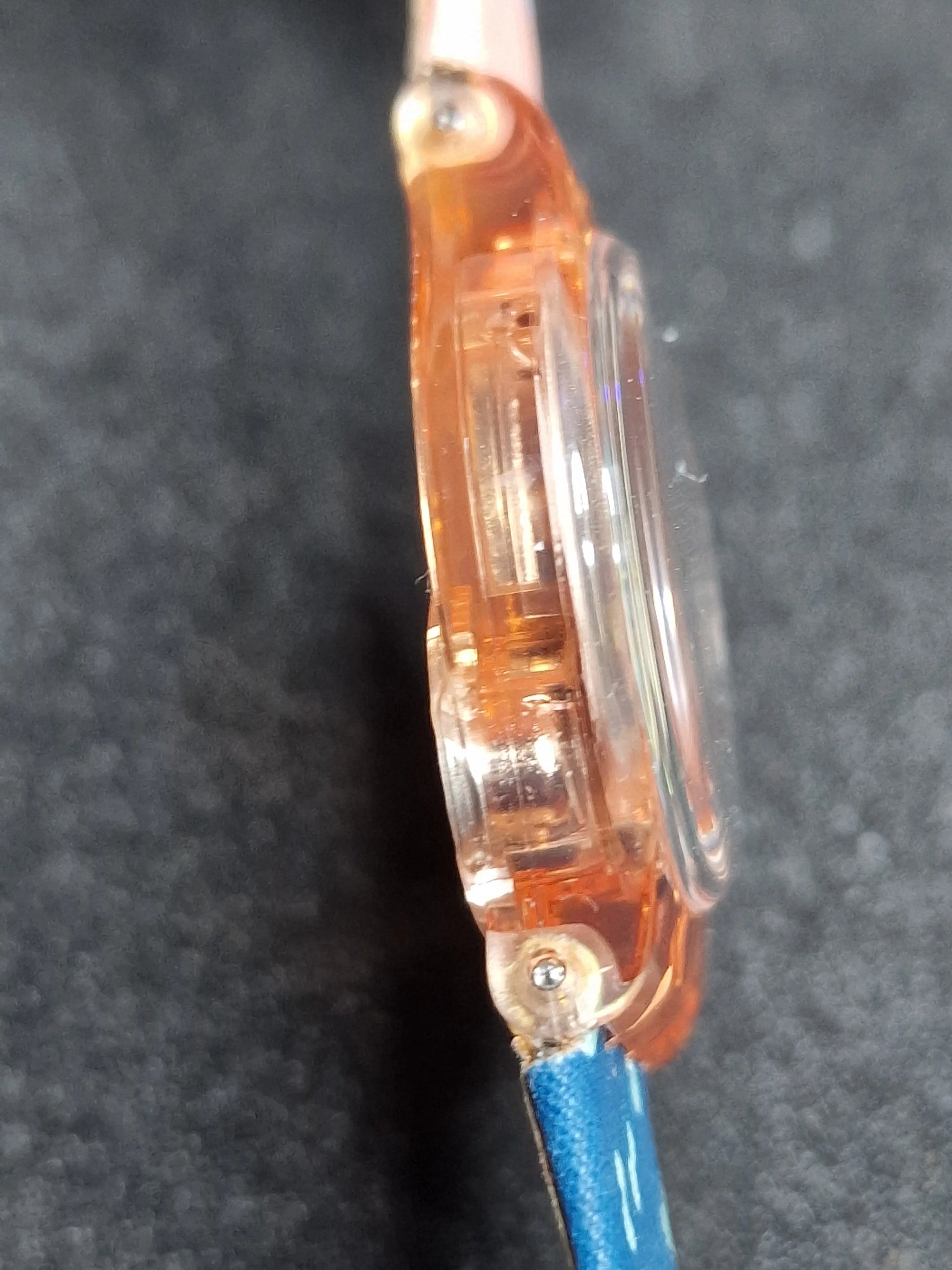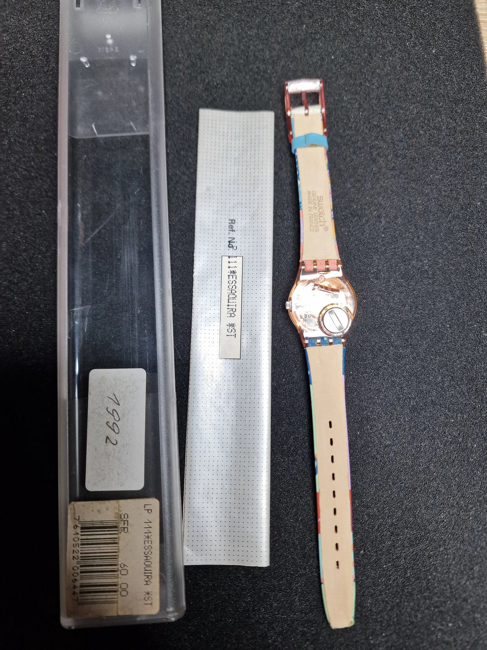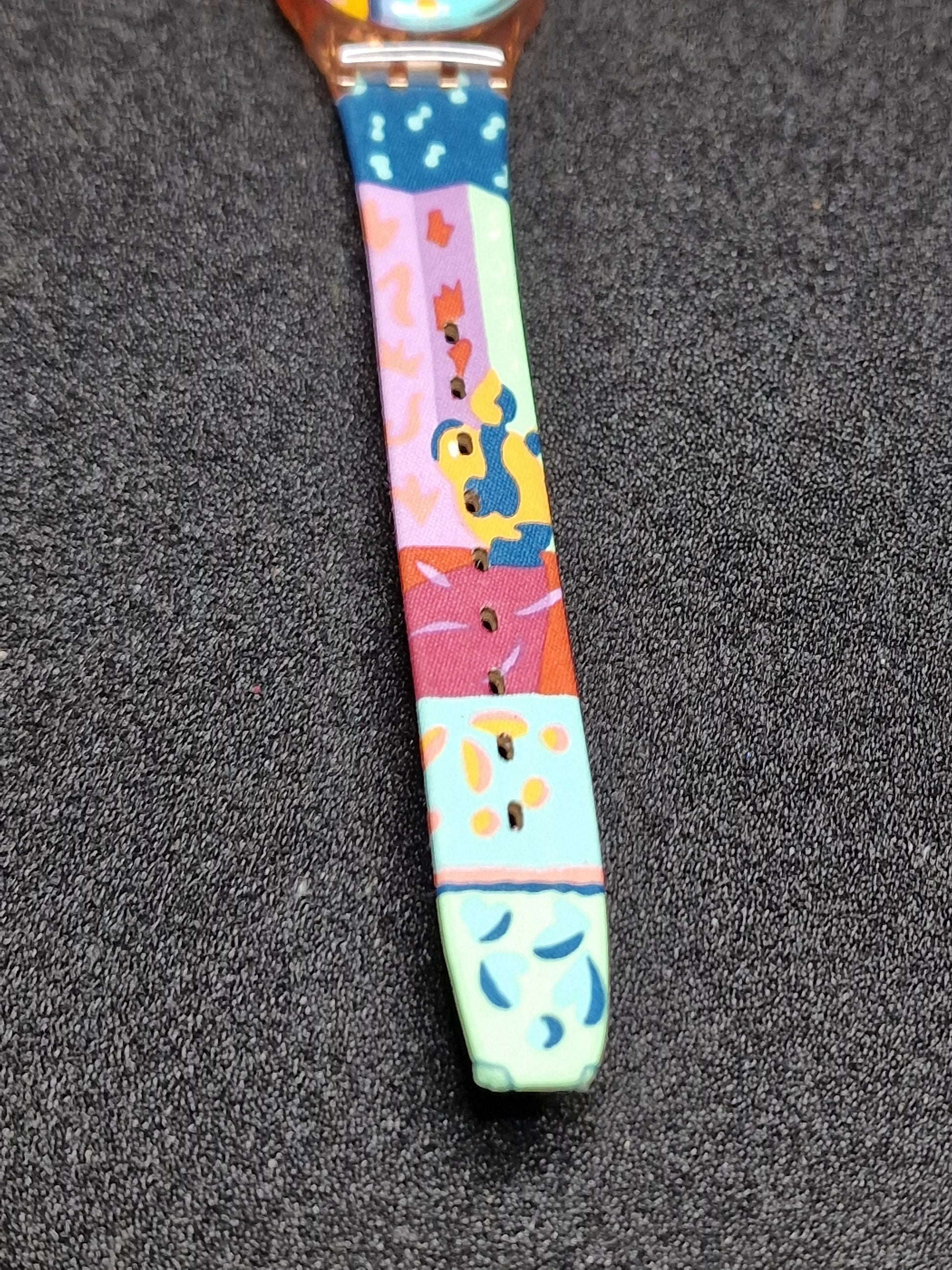 This Swatch Lady LP111 Essaouira from 1992 is a true collector’s highlight. Its colorful Moroccan-inspired design in pink, blue, orange, and yellow brings out a joyful 90s aesthetic. Under UV/black light, the watch reveals an amazing glow effect, making it stand out even more.