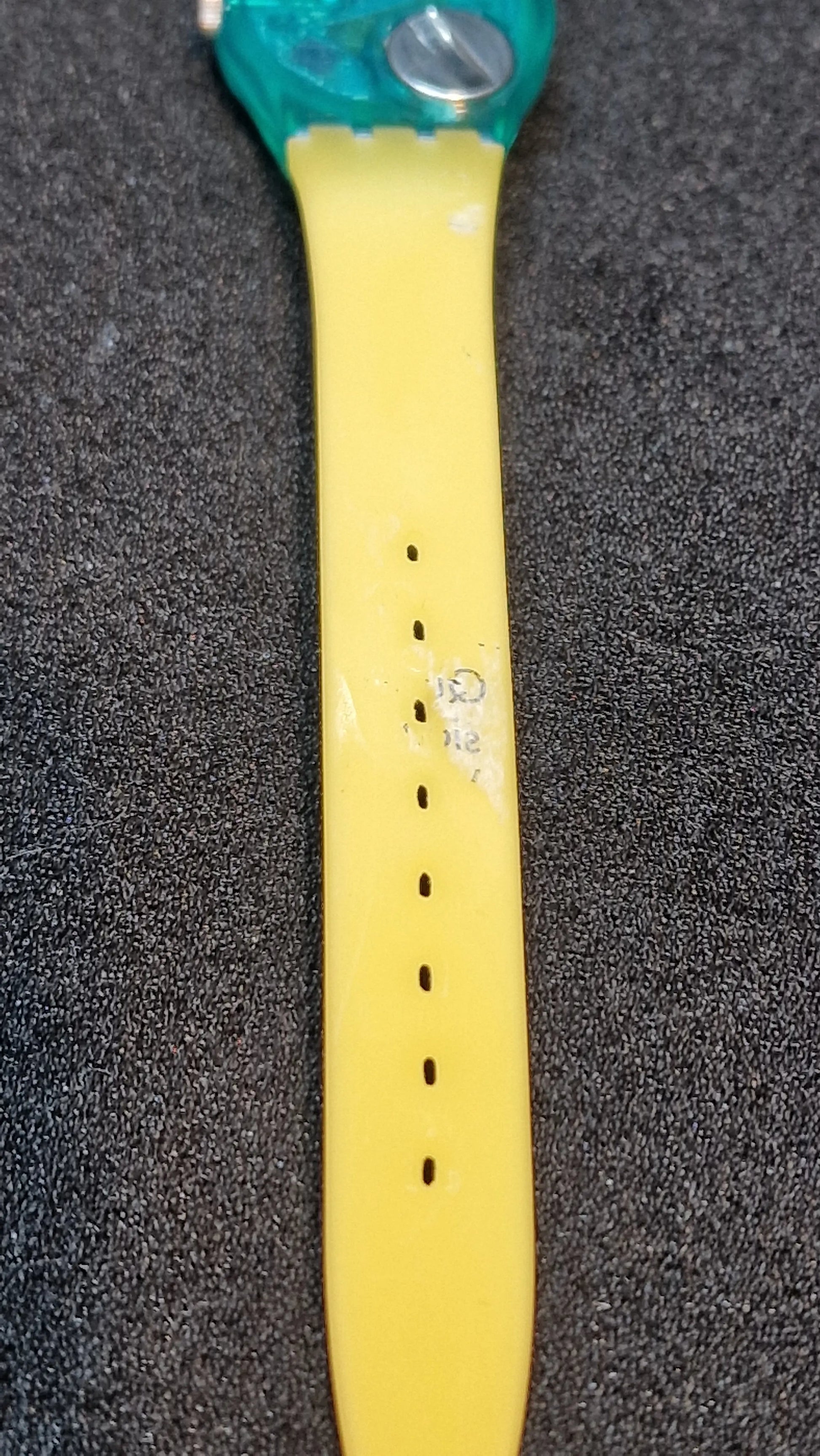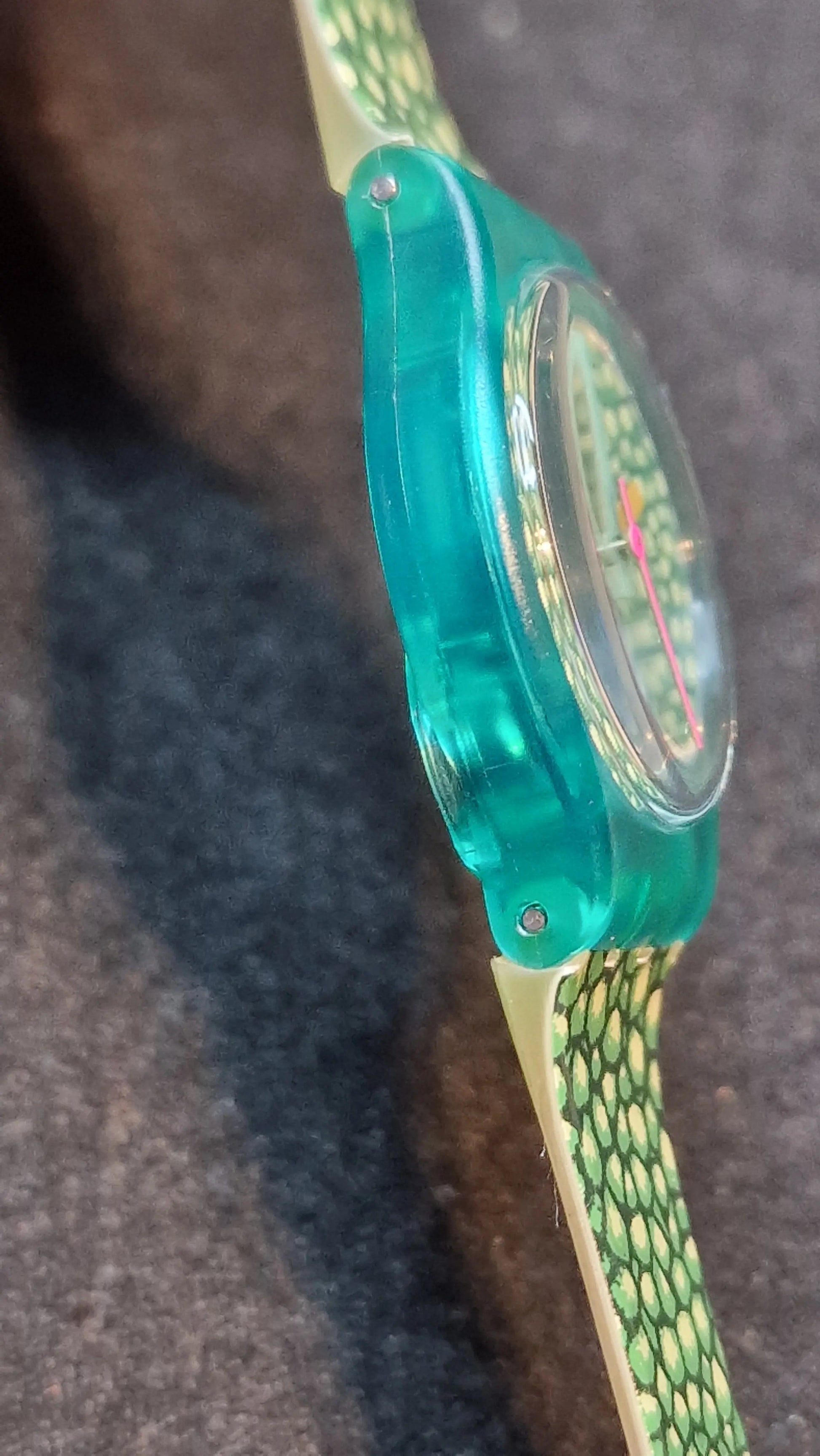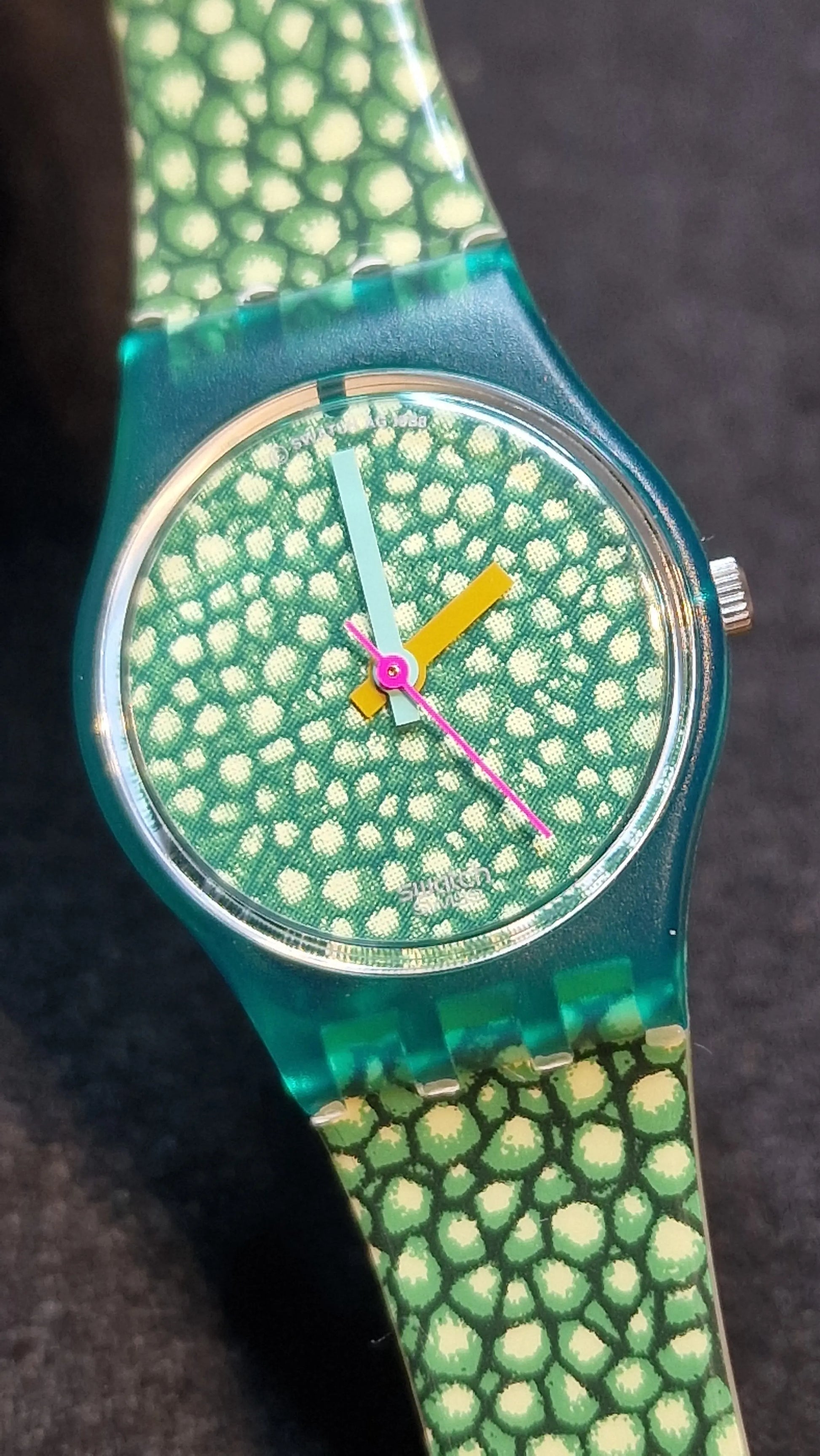 This watch is part of the late 80’s art-inspired Swatch Lady collection, known for experimental textures and playful colors. LL103 is one of the most recognizable models thanks to its unique dotted reptile-style pattern.