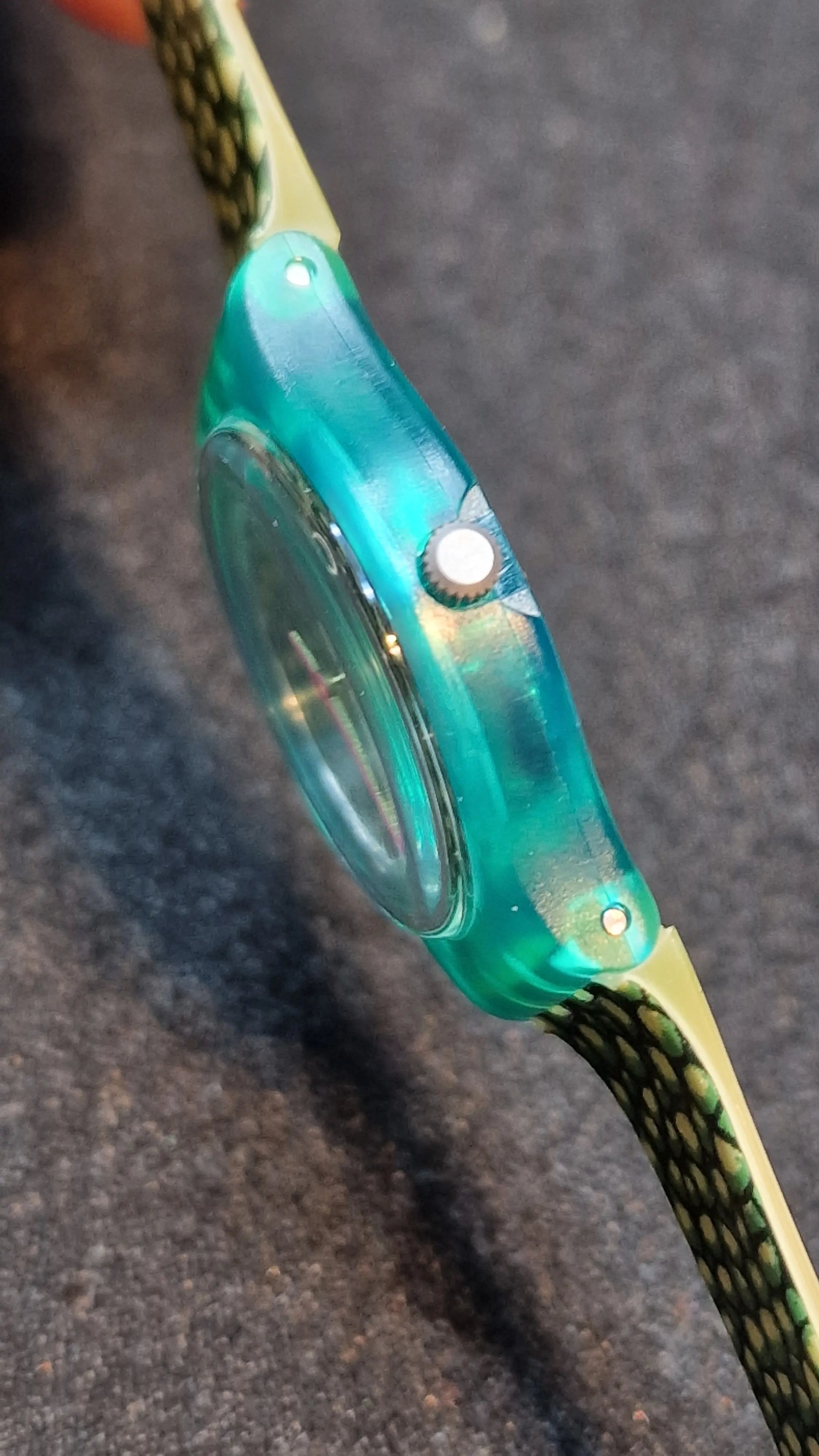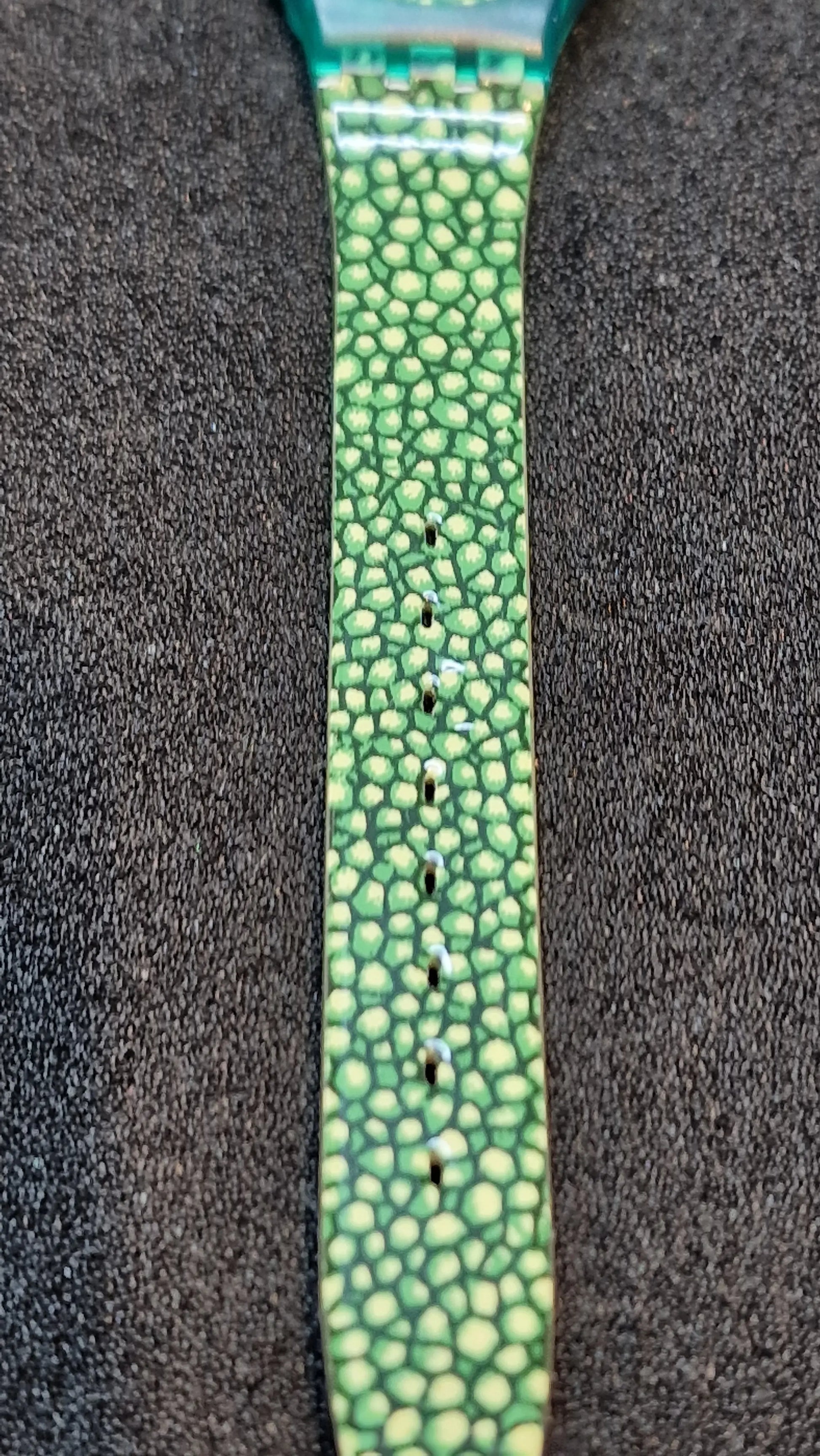 A rare and beautiful Swatch LL103 “South Molton” from 1988, featuring the iconic green stingray-pattern dial and matching strap. A true collectors’ piece from the early Swatch Lady line.